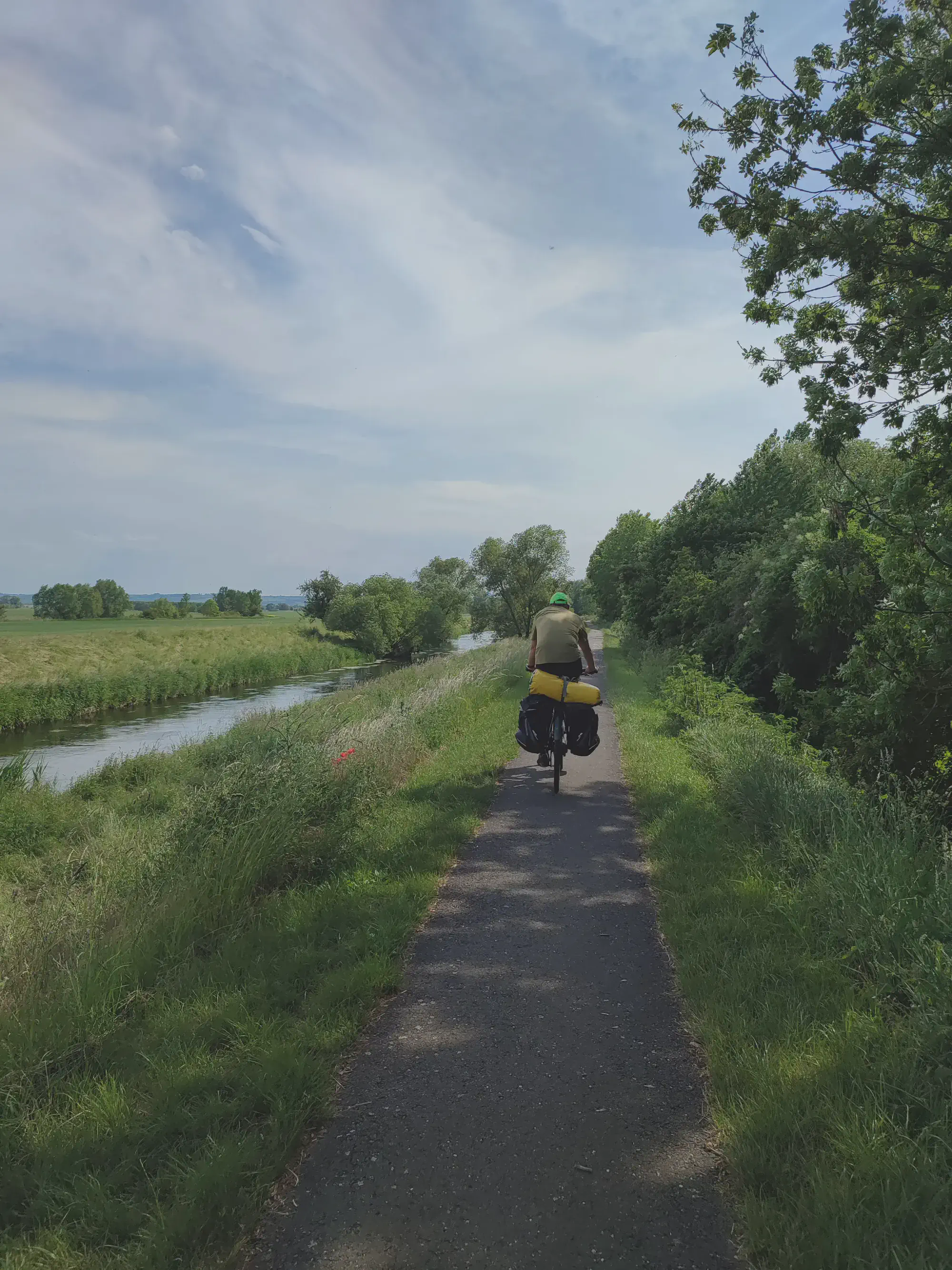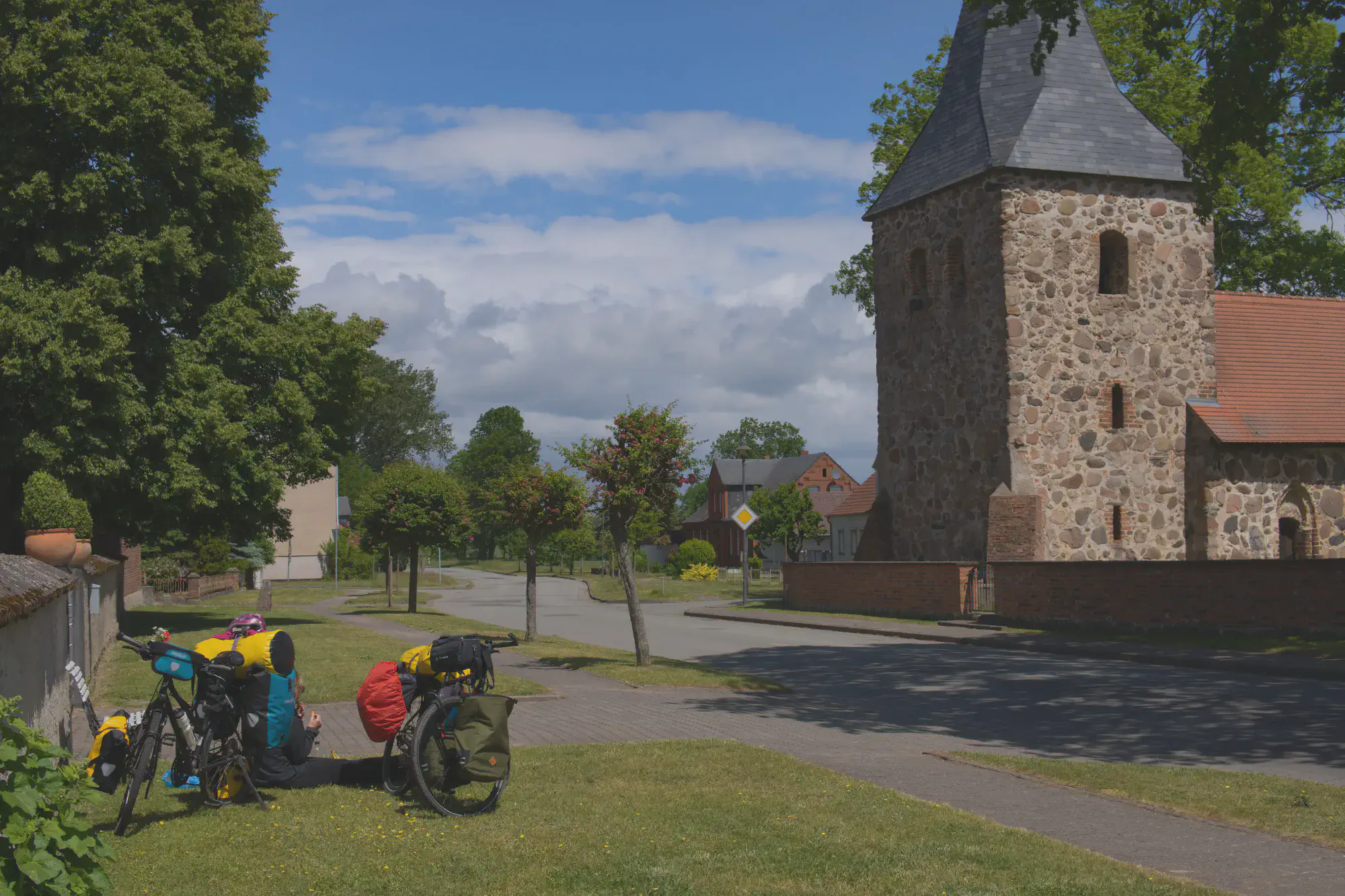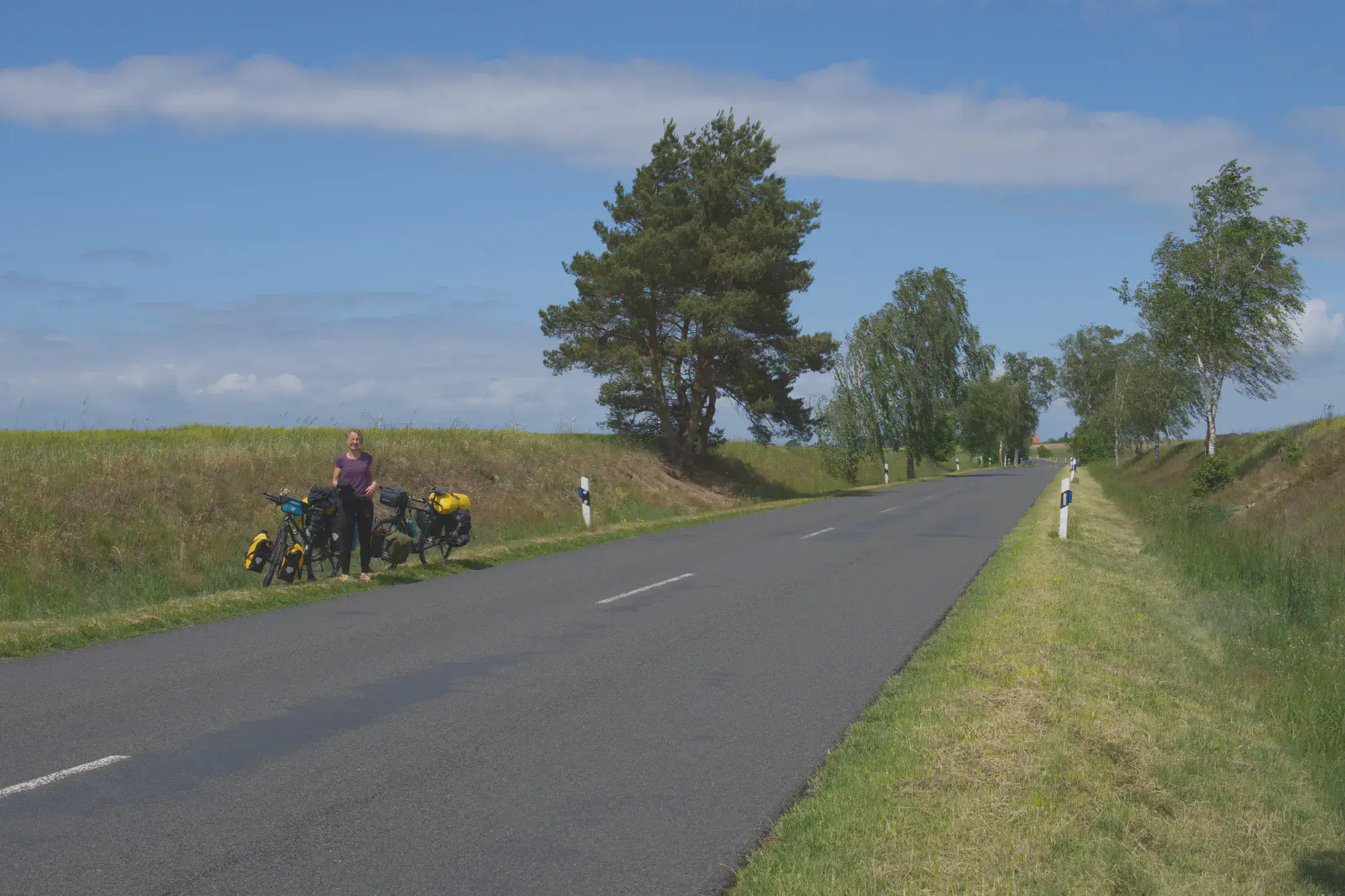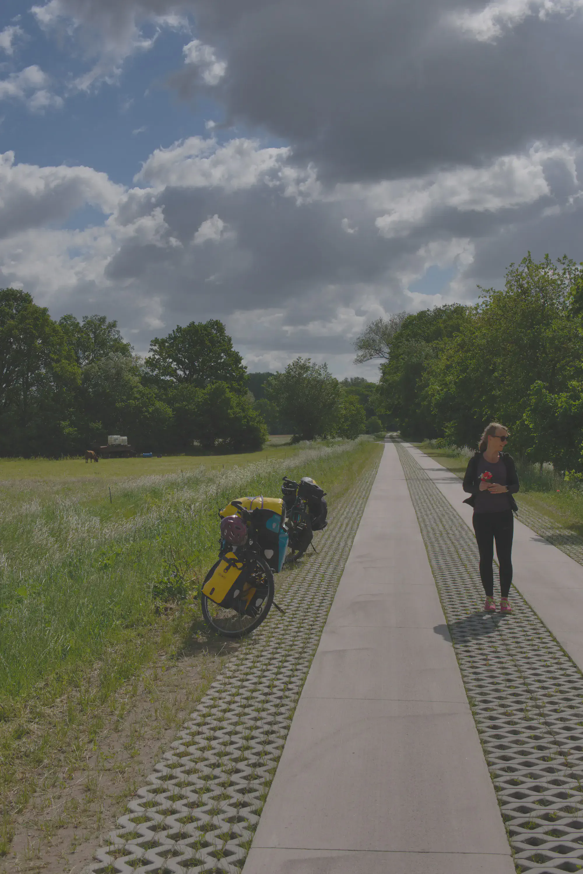 Spätestens auf dieser Etappe wird auch klar warum es Iron Curtain TRAIL heißt und nicht Iron Curtain Highway. Von Waldwegen über Schotter, abgerissene Bitumendecken, Kopfsteinpflaster und immer wieder Kolonnenwegen aus Betonformplatten war heute alles dabei. Das senkt die Reisegeschwindigkeit etwas, dafür bleibt mehr Zeit die traumhafte Landschaft zu genießen. Es gibt auch wieder Schilder! Nach 120km bei Marienborn könnten wir endlich digitale und analoge Welt wieder vereinen. Außerdem hatten wir heute ausreichend Gelegenheit unsere Regenkollektion auszuführen und dennoch genau eine halbe Stunde Sonne pur in Schöningen um Caffee&Kuchen zu genießen. Kann man im strömenden Regen eigentlich ein Zelt aufbauen? Klar, muß man aber nicht wenn es so herrliche Gästezimmer in Veltheim gibt. Mit heißer Dusche. :-))