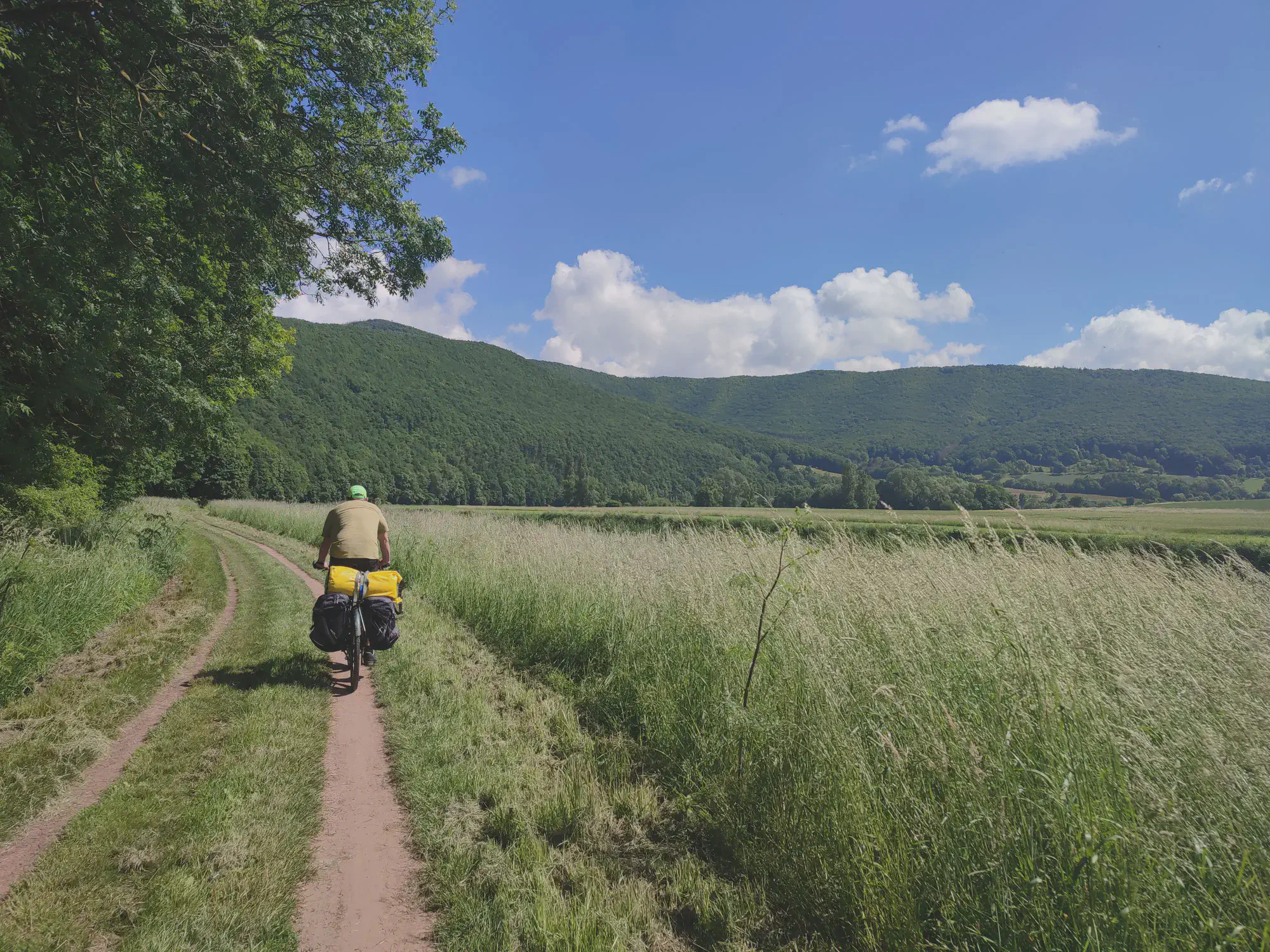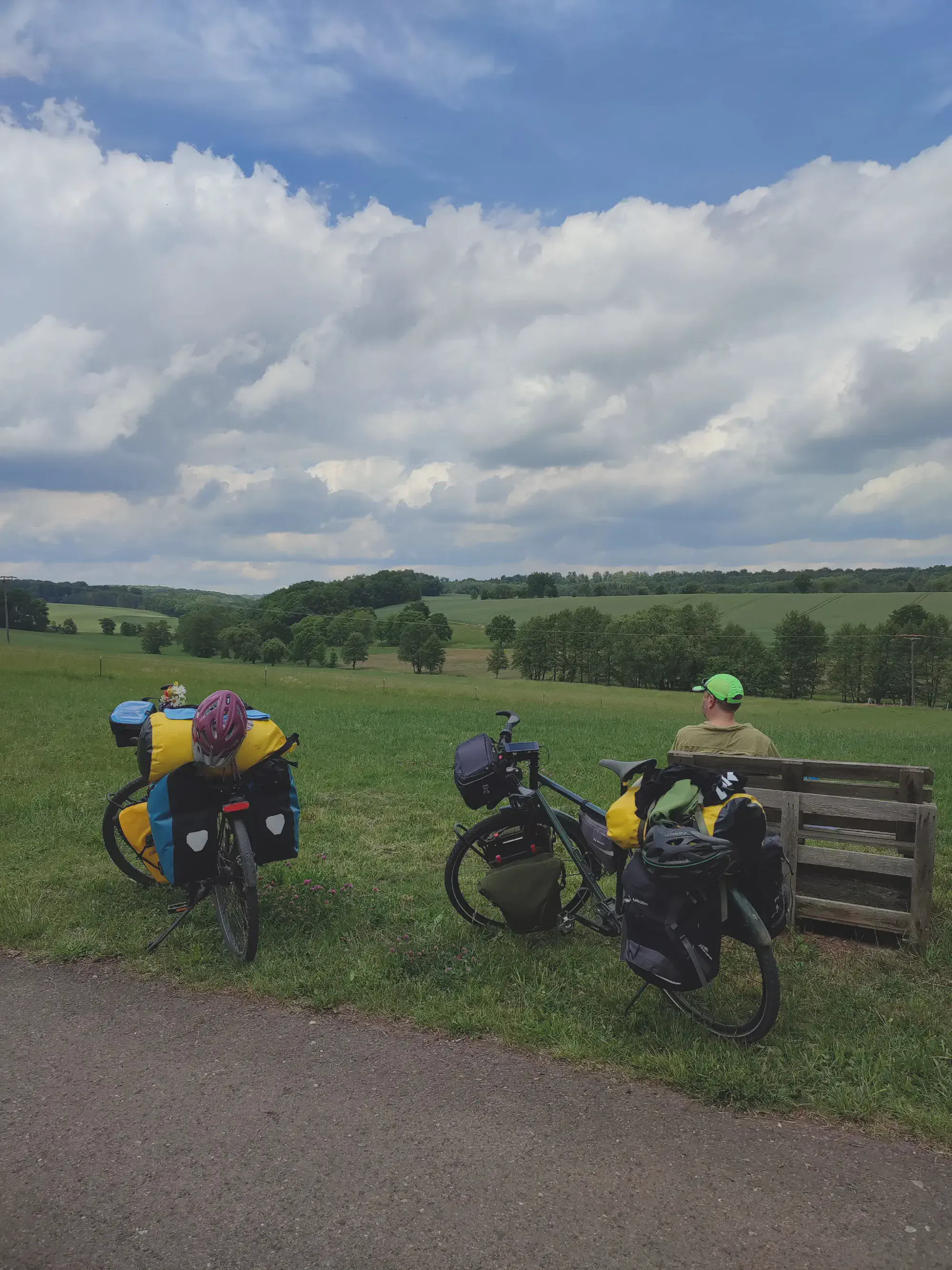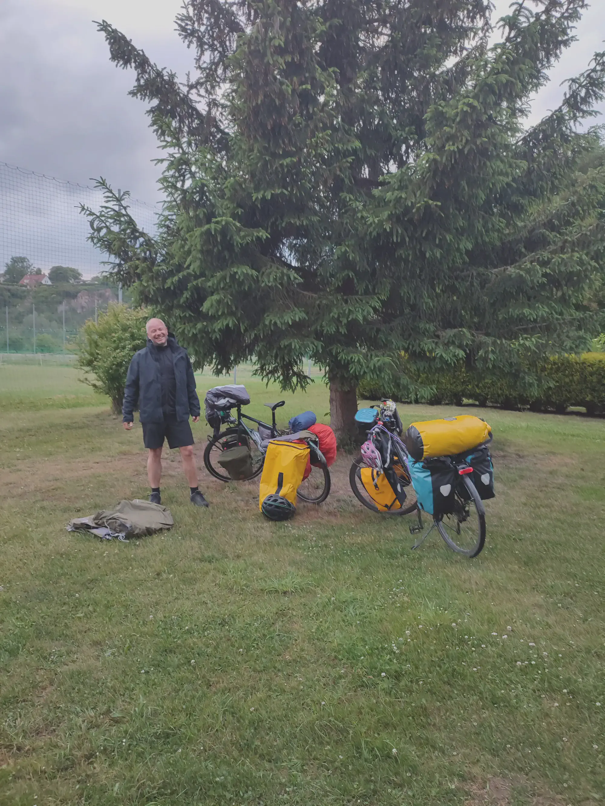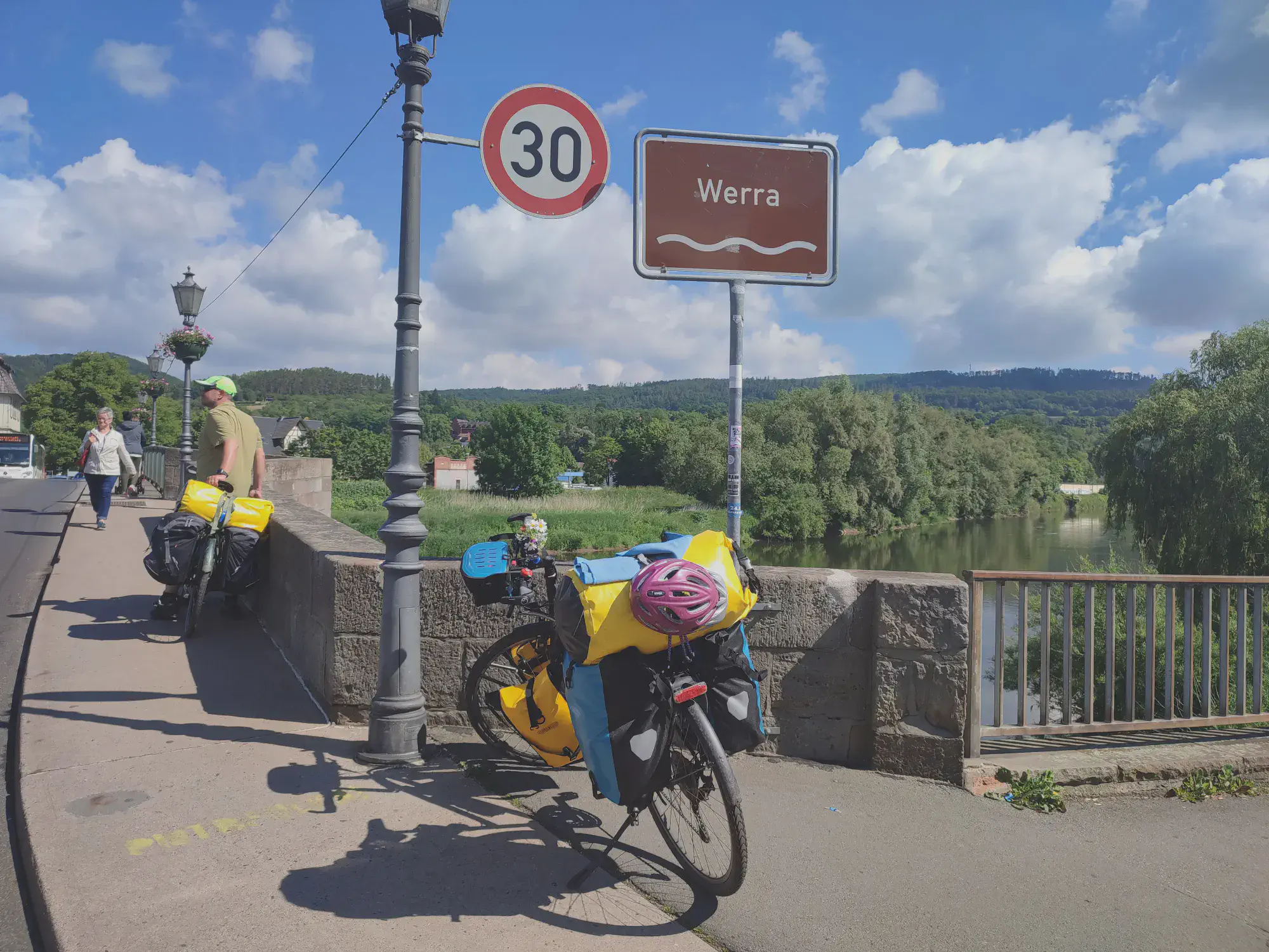 Uns hat der Fuchs in der Nacht den Caffee geklaut hat (das wird der Fuchsmutti nicht gefallen haben was der Vati da nach Hause gebracht hat…), deshalb wurde die rasante Abfahrt am Südhang des Harzes durch ein schönes zweites Frühstück am Brunnen in Zorge unterbrochen. Da wir in den letzten Tagen etwas Vorsprung rausgefahren hatten, haben wir die Route spontan etwas erweitert und sind an diesem Tag doch noch den Eurovelo13 weitergefahren, statt bereits in Bad Heiligenstadt nach Süden abzubiegen. Durch herrlich hügelige Landschaft, strahlenden Sonnenschein, strömenden Regen und kühle Täler sind wir am Ende ~110km und ~1200Hm gefahren, trotz ausgiebiger Pause im wunderschönen Duderstadt. Der Campingplatz im Werratal ist sehr schön gelegen.