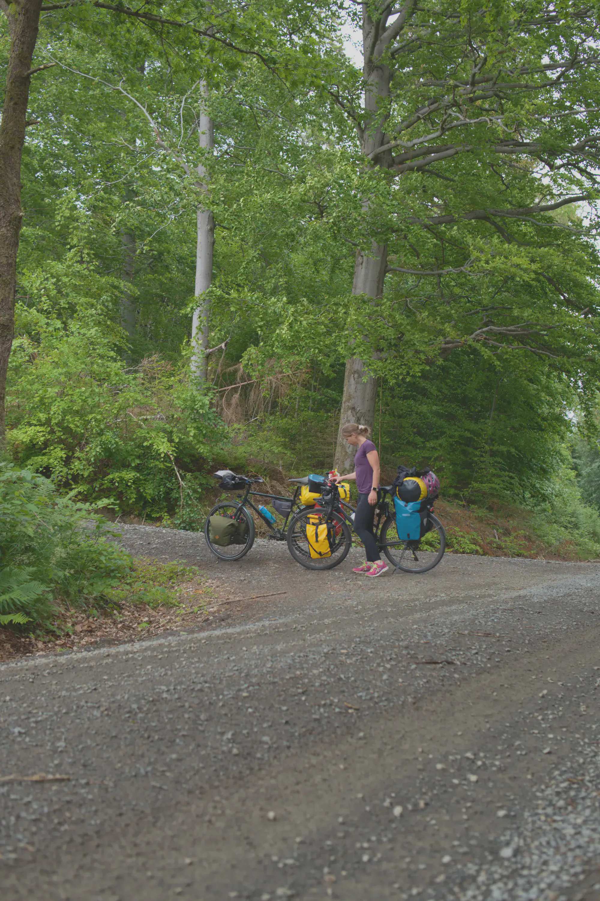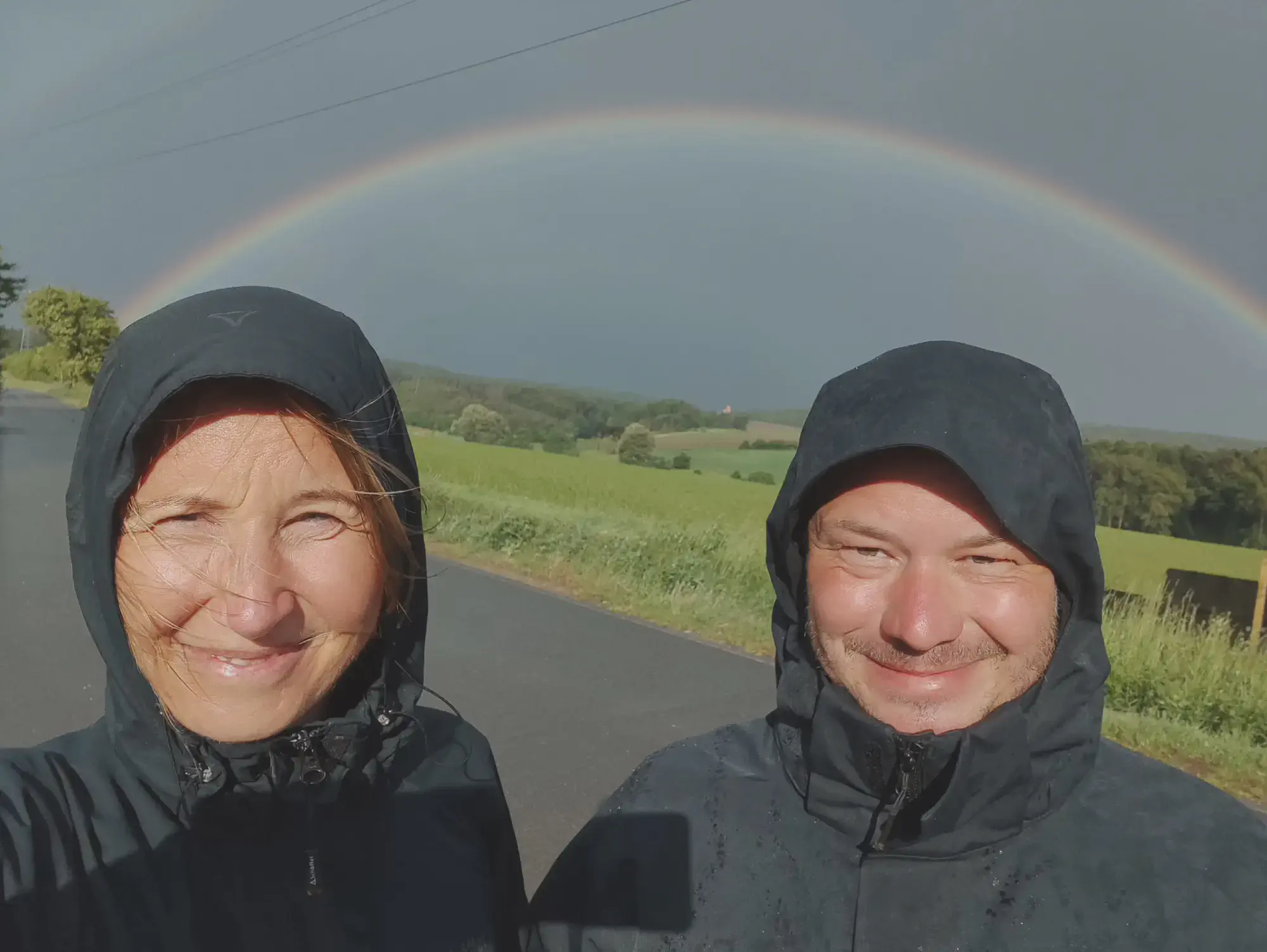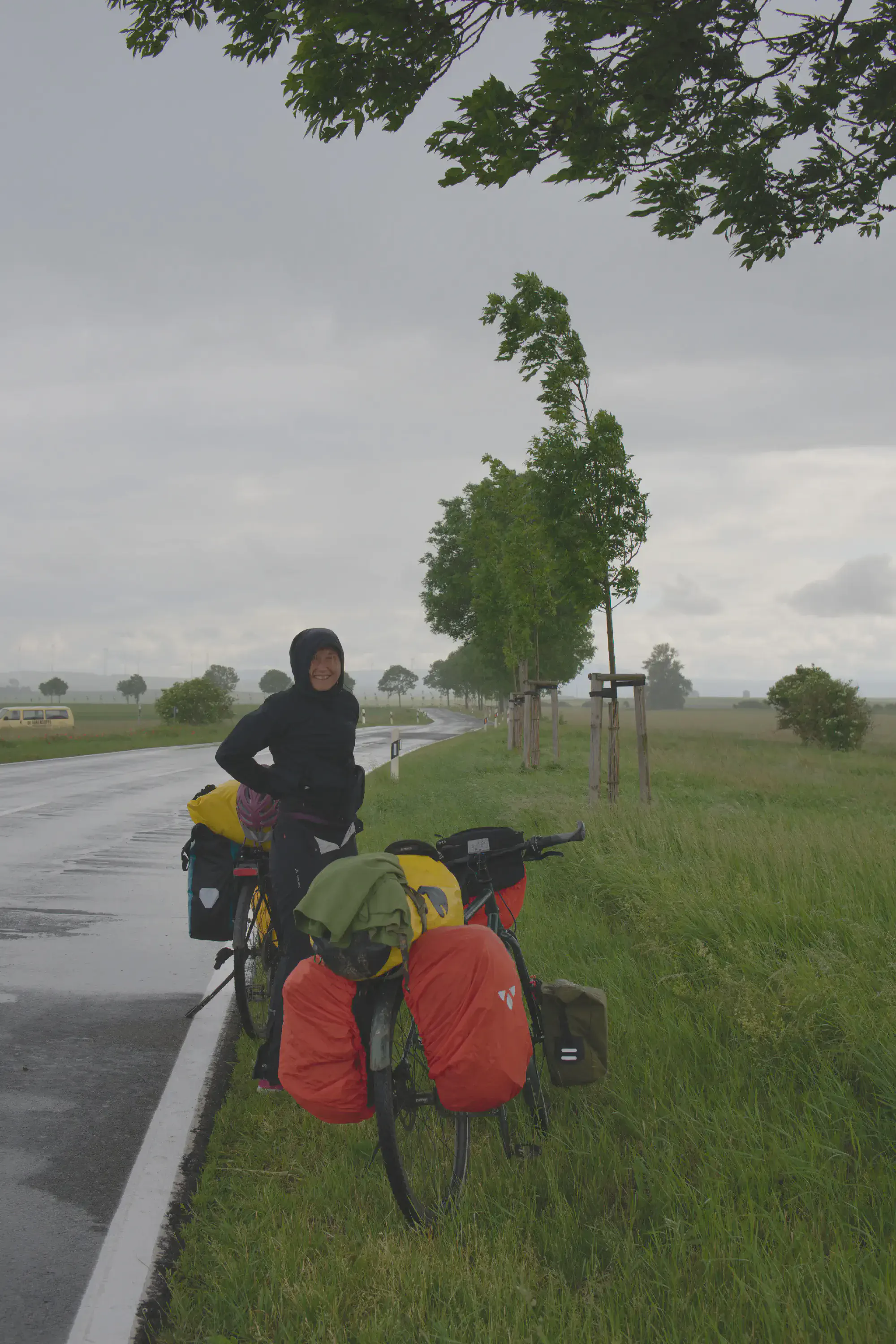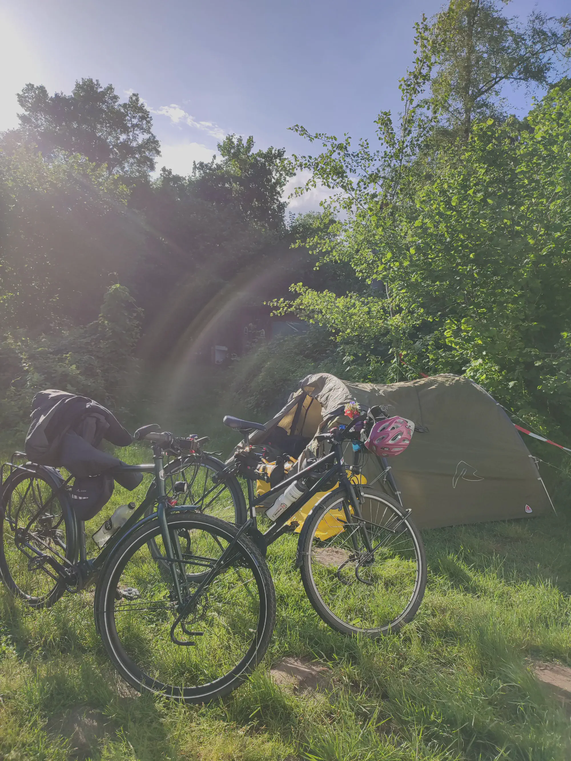 Uns hat der Fuchs in der Nacht den Caffee geklaut hat (das wird der Fuchsmutti nicht gefallen haben was der Vati da nach Hause gebracht hat…), deshalb wurde die rasante Abfahrt am Südhang des Harzes durch ein schönes zweites Frühstück am Brunnen in Zorge unterbrochen. Da wir in den letzten Tagen etwas Vorsprung rausgefahren hatten, haben wir die Route spontan etwas erweitert und sind an diesem Tag doch noch den Eurovelo13 weitergefahren, statt bereits in Bad Heiligenstadt nach Süden abzubiegen. Durch herrlich hügelige Landschaft, strahlenden Sonnenschein, strömenden Regen und kühle Täler sind wir am Ende ~110km und ~1200Hm gefahren, trotz ausgiebiger Pause im wunderschönen Duderstadt. Der Campingplatz im Werratal ist sehr schön gelegen.