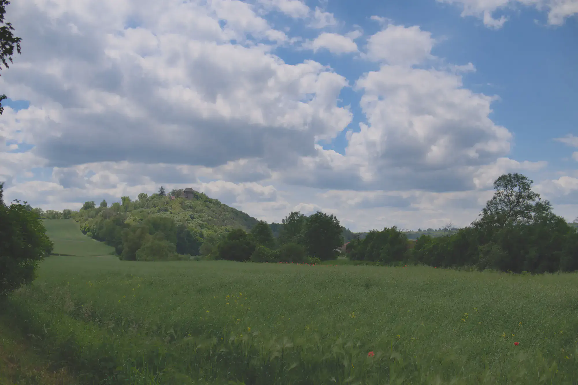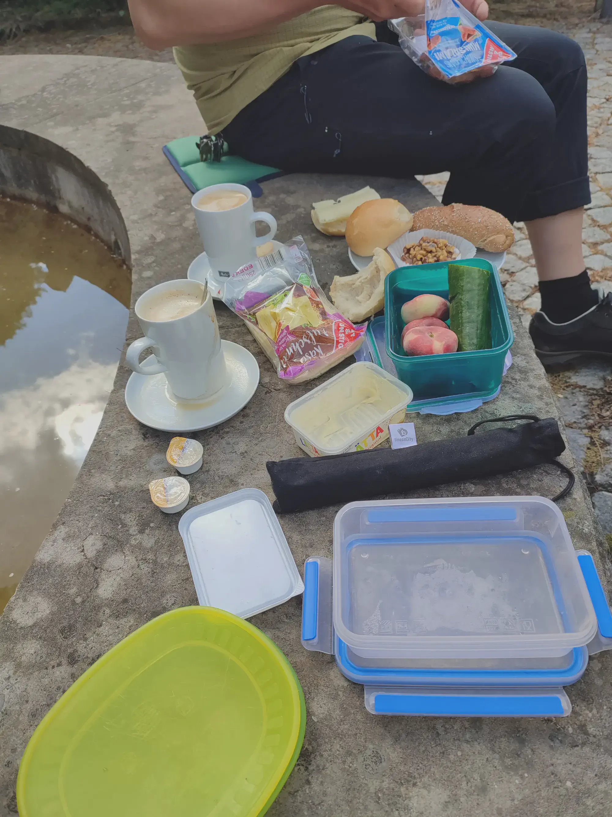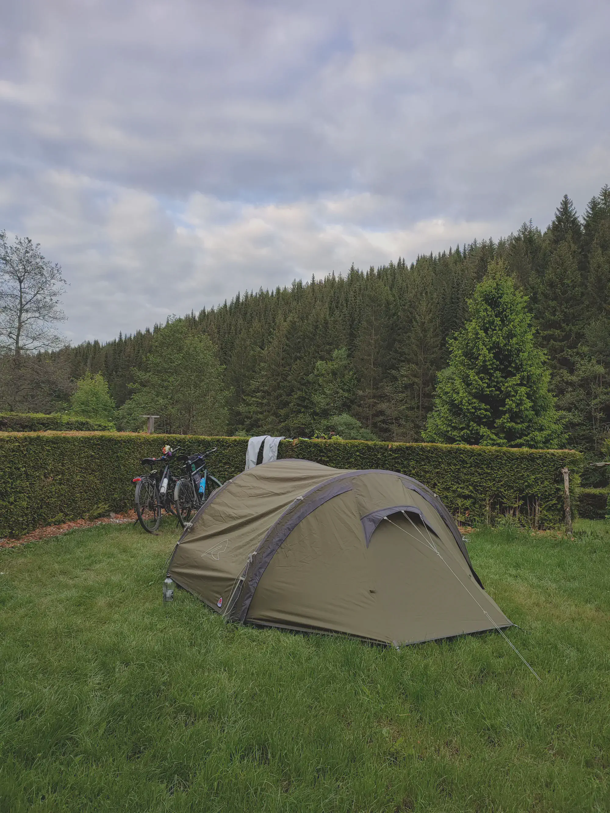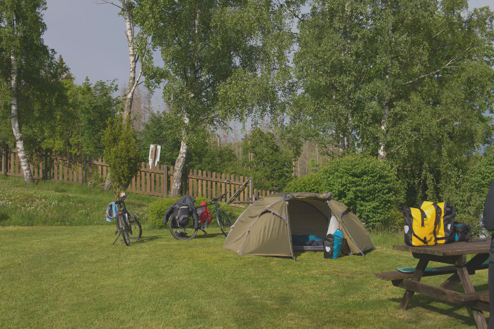 Uns hat der Fuchs in der Nacht den Caffee geklaut hat (das wird der Fuchsmutti nicht gefallen haben was der Vati da nach Hause gebracht hat…), deshalb wurde die rasante Abfahrt am Südhang des Harzes durch ein schönes zweites Frühstück am Brunnen in Zorge unterbrochen. Da wir in den letzten Tagen etwas Vorsprung rausgefahren hatten, haben wir die Route spontan etwas erweitert und sind an diesem Tag doch noch den Eurovelo13 weitergefahren, statt bereits in Bad Heiligenstadt nach Süden abzubiegen. Durch herrlich hügelige Landschaft, strahlenden Sonnenschein, strömenden Regen und kühle Täler sind wir am Ende ~110km und ~1200Hm gefahren, trotz ausgiebiger Pause im wunderschönen Duderstadt. Der Campingplatz im Werratal ist sehr schön gelegen.