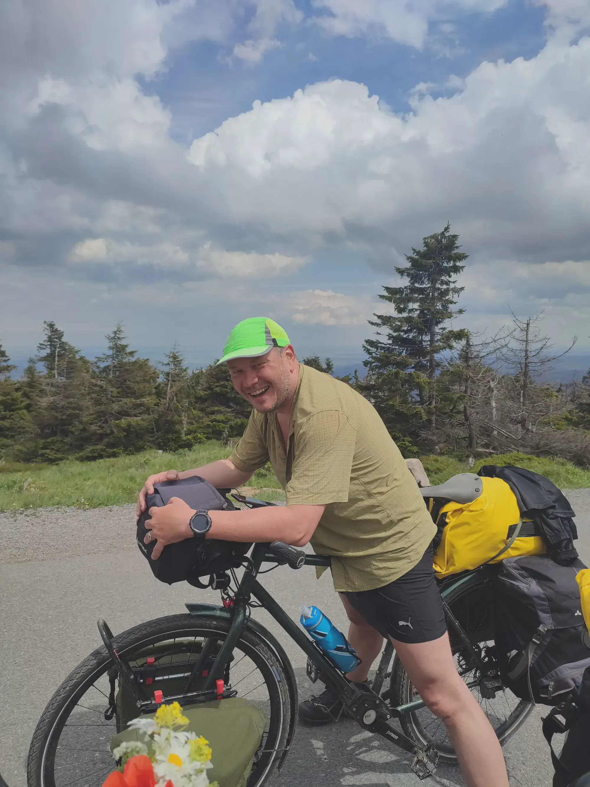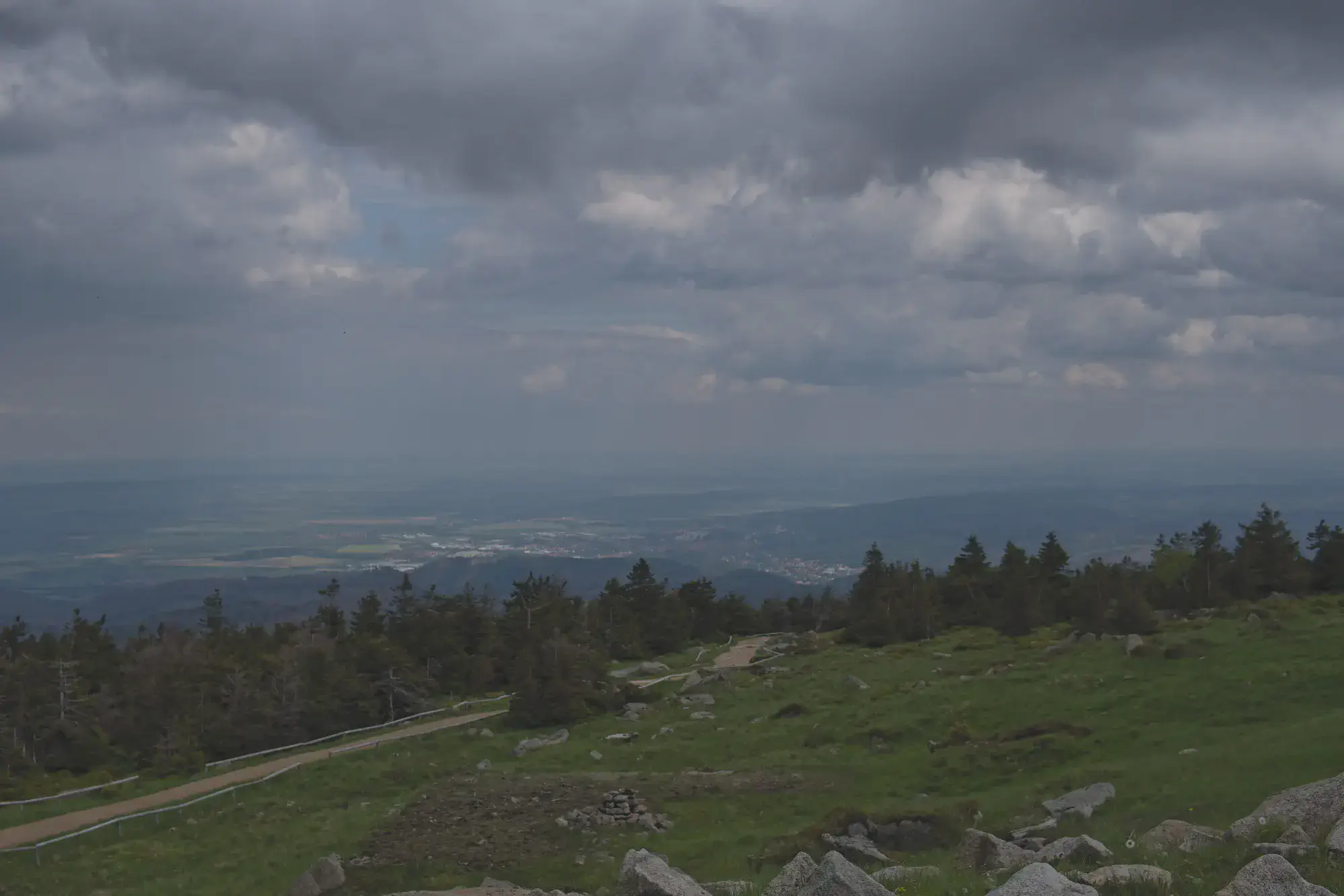 Wenn man schon in der Gegend ist kann man ja auch mal auf den Brocken hochfahren statt stur der ehemaligen Grenze zu folgen 8-). Vom Okerstausee über das Kellwassertal bis nach Torfhaus, dann den Goetheweg und an der Harzbahn entlang bis zum Gipfel. Grandios. Wir hatten sogar Sonnenschein und schöne Aussicht! Lohn der Mühen war dann die Abfahrt über die Brockenstraße (Achtung 30!). Eine Alternative zu unserer Tour ist es, schon eher — in Schierke — zu campieren. Das erspart ein paar Kilometer. Für uns ging es weiter über Sorge und Elend, wo es noch einen erhaltenen Originalabschnitt der Grenzsichungsanlagen gibt, auf Kolonnenwegen bis zu diesem herrlichen Zeltplatz in der Abendsonne von Hohegeiß. Achtung: Warnung vor dem Fuchse.