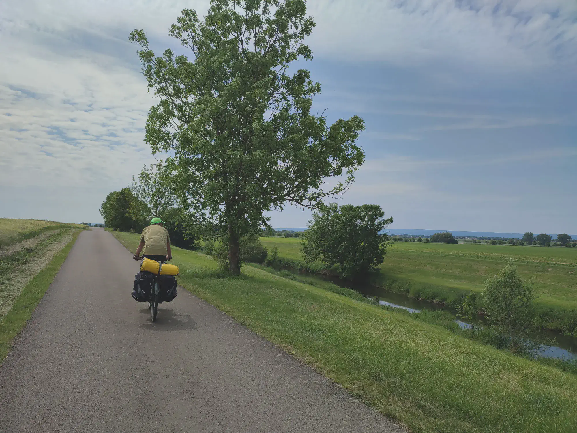 Nach einer kühlen Nacht im Werratal starteten wir gemütlich in einen herrlich frühsommerlichen Tag. 60km folgten wir dem Werratalradweg — diesmal von Nord nach Süd. Er bleibt einer der schönsten Radwege die wir bisher gefahren sind, zauberhafte Landschaft, tip-top ausgebaut und ausgeschildert, das macht Hessen echt super! Aber auch unsere heutige Neuentdeckung ist eine absolute Empfehlung wert: der Unstrut-Werra-Radweg. Von Treffurt schlängelt er sich auf einer alten Bahnstrecke das Tal entlang hinauf bis in den Hainich, dort wartet dann eine 10km Abfahrt durch den Wald, traumhaft! In Mühlhausen gibt es den Campingplatz am Schwanenteich. Falls der Kocher mal kalt bleiben soll: Das Ganesha ist eine Empfehlung.