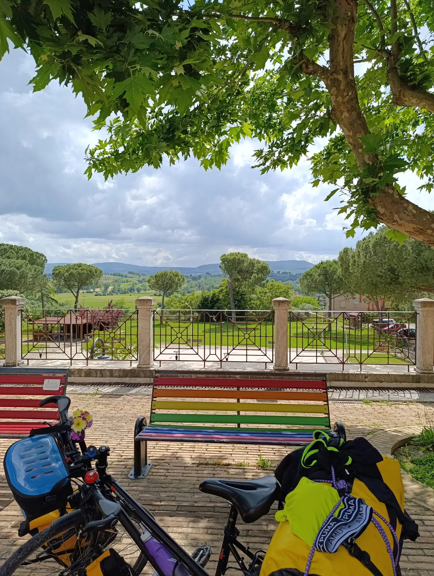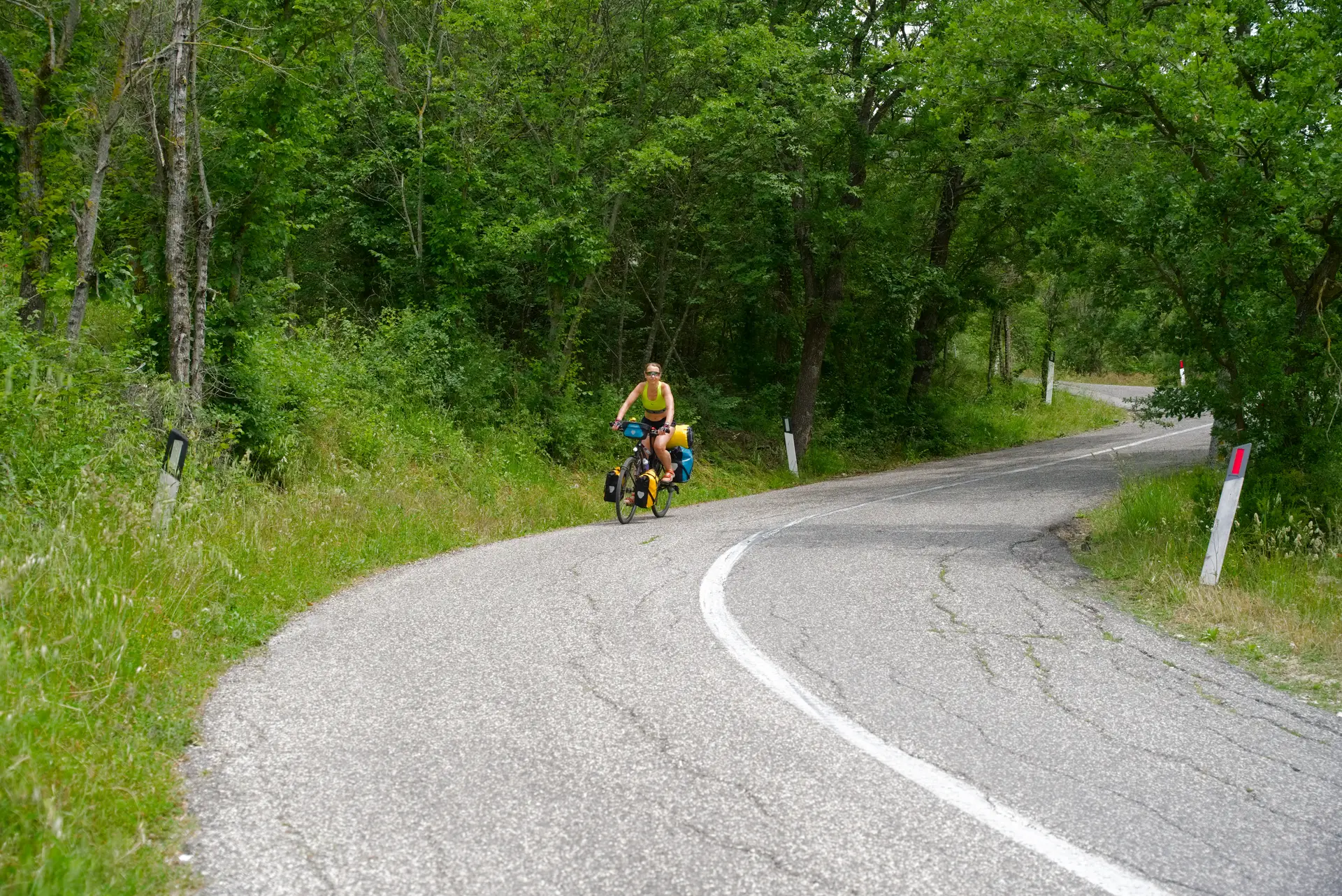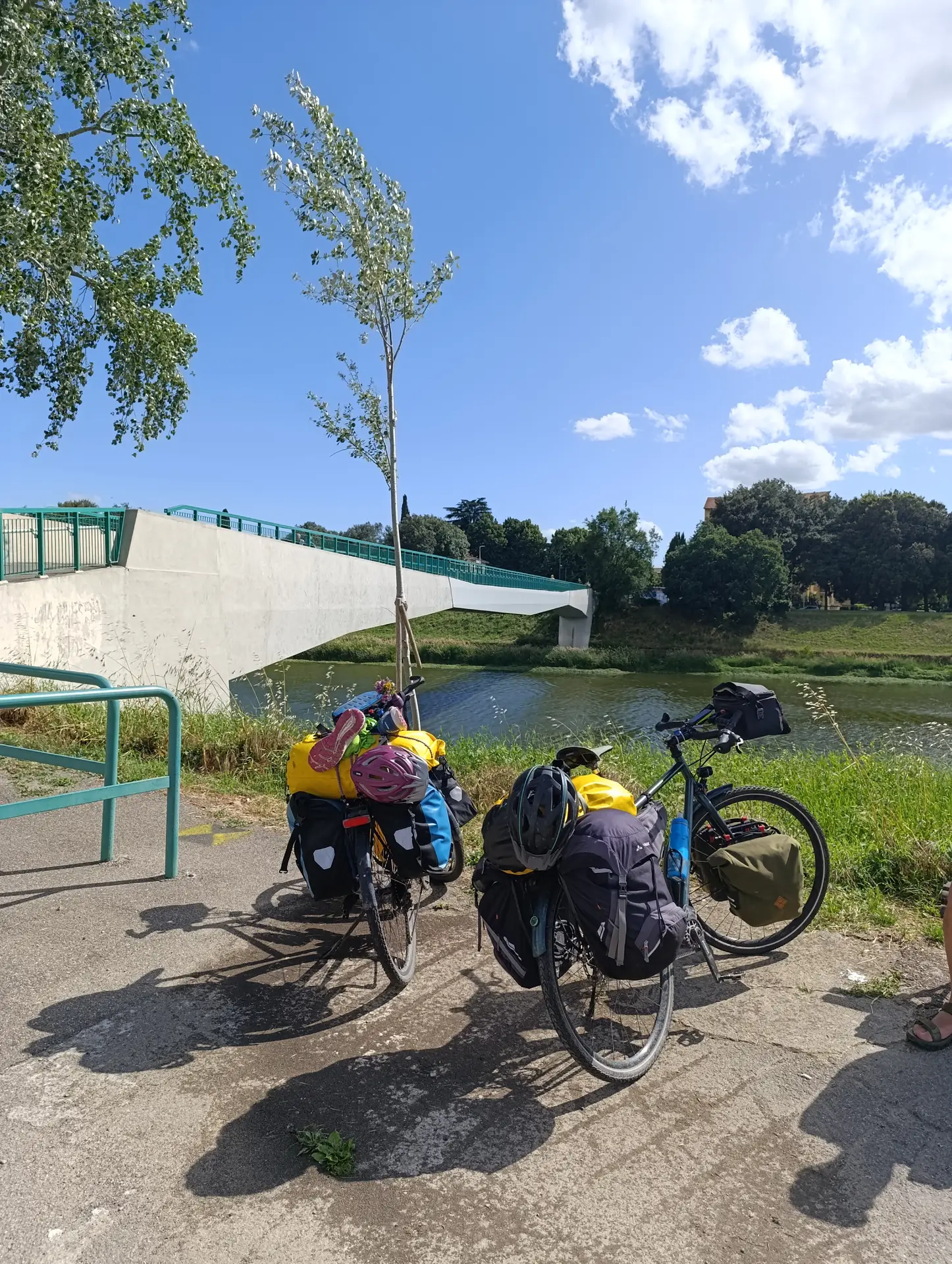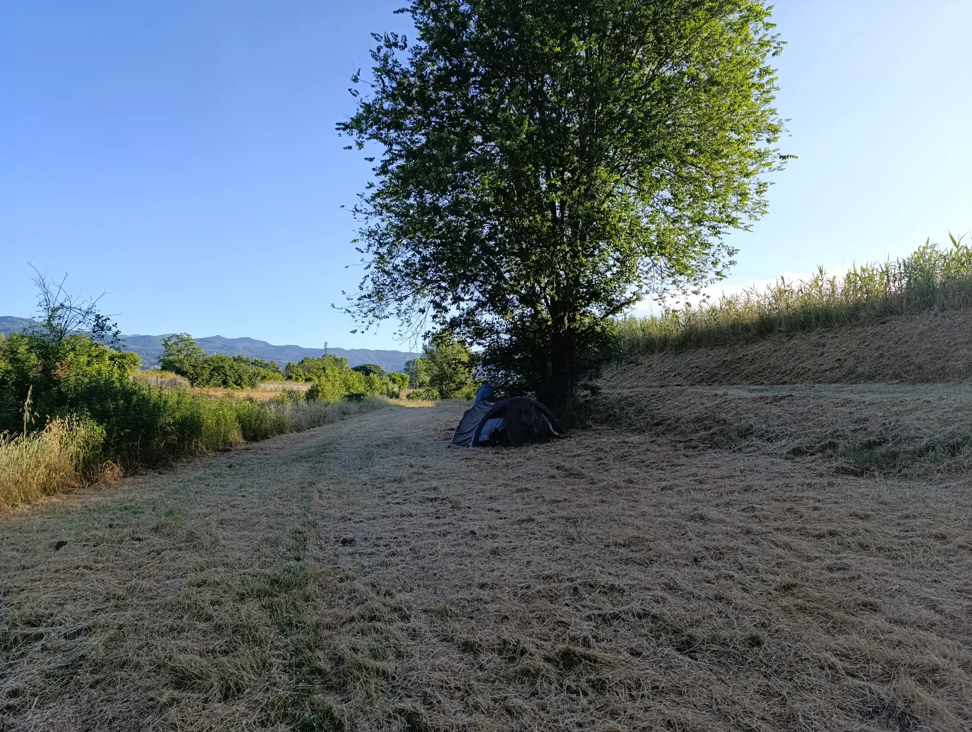 In Pistoia war es schwierig, eine passende Unterkunft zu finden. Also habe ich am Fluss eine schöne, kleine und frisch gemähte Wiese gefunden. Wir haben vorher in der Stadt noch Pizza und Getränke geholt und dann unser Zelt direkt am Ufer aufgeschlagen. Der Abend war einfach wunderschön: Wir aßen unsere Pizza, umgeben vom lauten Quaken der Frösche und dem Leuchten unzähliger Glühwürmchen.