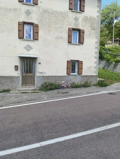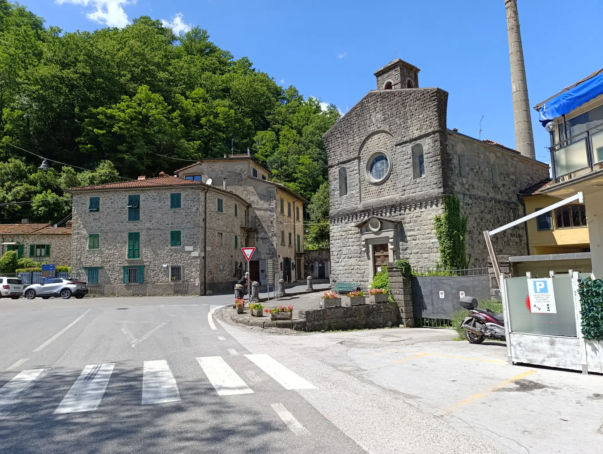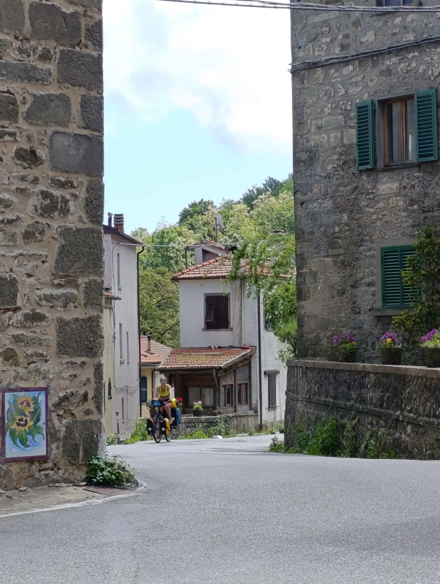 Unsere erste Kaffeepause machten wir wie so oft in einer kleinen Pizzeria-Bar, der “My Bar” in Cireglio. Die Einheimischen haben uns sofort ausgefragt, was wir machen und warum. Kurz nach der Pause, auf dem weiteren Weg nach oben, kamen wir an einer wunderschön gestalteten Quelle vorbei, der Fonte Tana a Campari in Le Piastre. Und dann wurde es richtig wild. Wir fuhren voll rein in den Apennin. Am Horizont konnten wir schon das Bergdorf sehen, in dem das nächste Restaurant auf uns wartete. Es war ein herrlich sonniger, aber nicht zu warmer Tag. Die Straße nach Prunetta habe ich wirklich genossen, es war eine Wonne, dort hochzufahren. Oben angekommen, gab es um Punkt 12 Uhr ein ausgiebiges Mittagessen. Es waren unglaublich viele andere Radfahrer unterwegs, die Stimmung war toll.