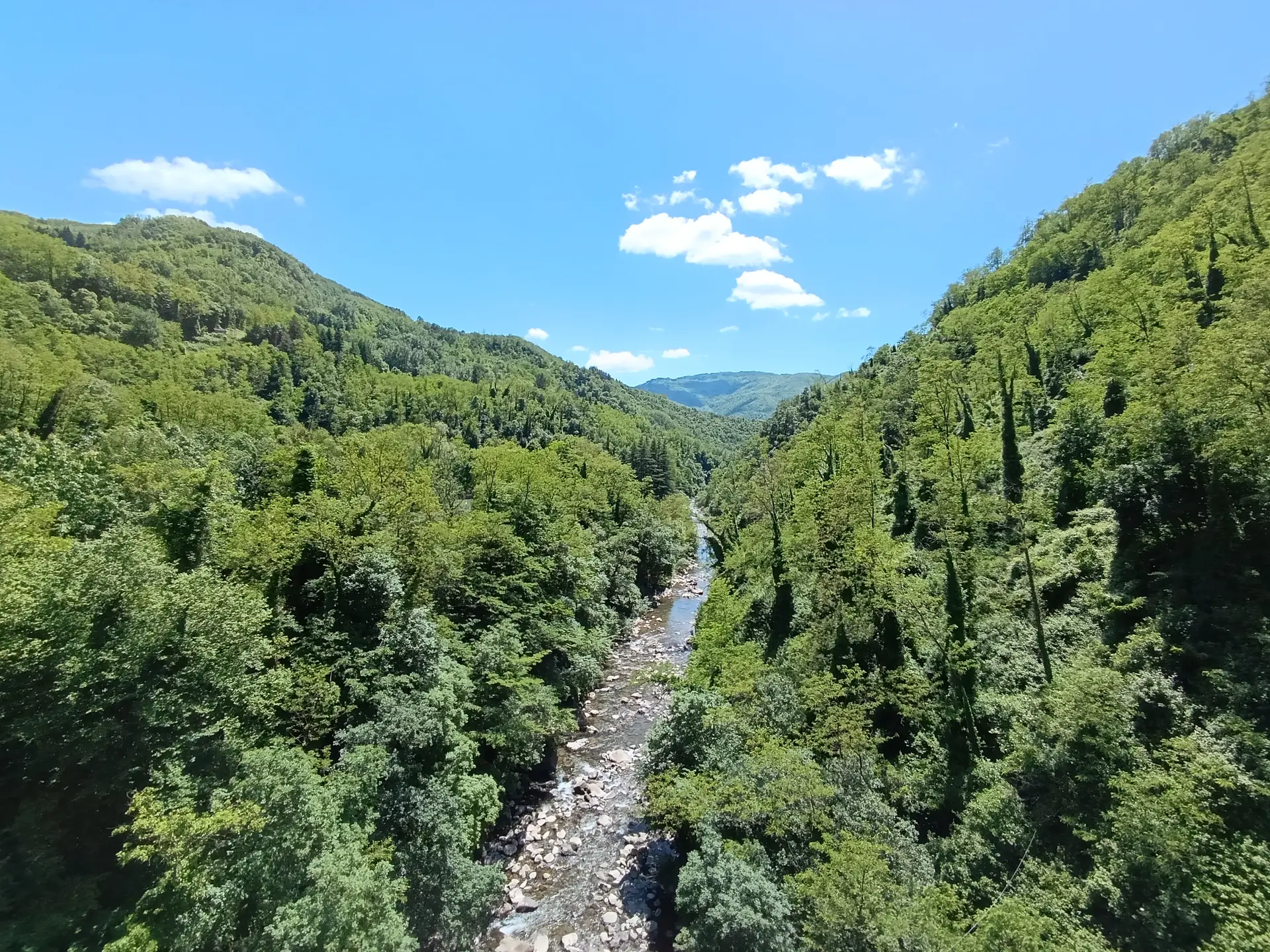 Nach einem Frühstück mit Blick Richtung Küste packten wir um neun Uhr die Räder. Die Route führte uns tiefer hinein in die hügelige und einsame Landschaft der Region Montefeltro. Bereits nach einer Stunde wartete eine fantastische Abfahrt durch das wunderschöne Tal des Flusses Metauro auf uns.