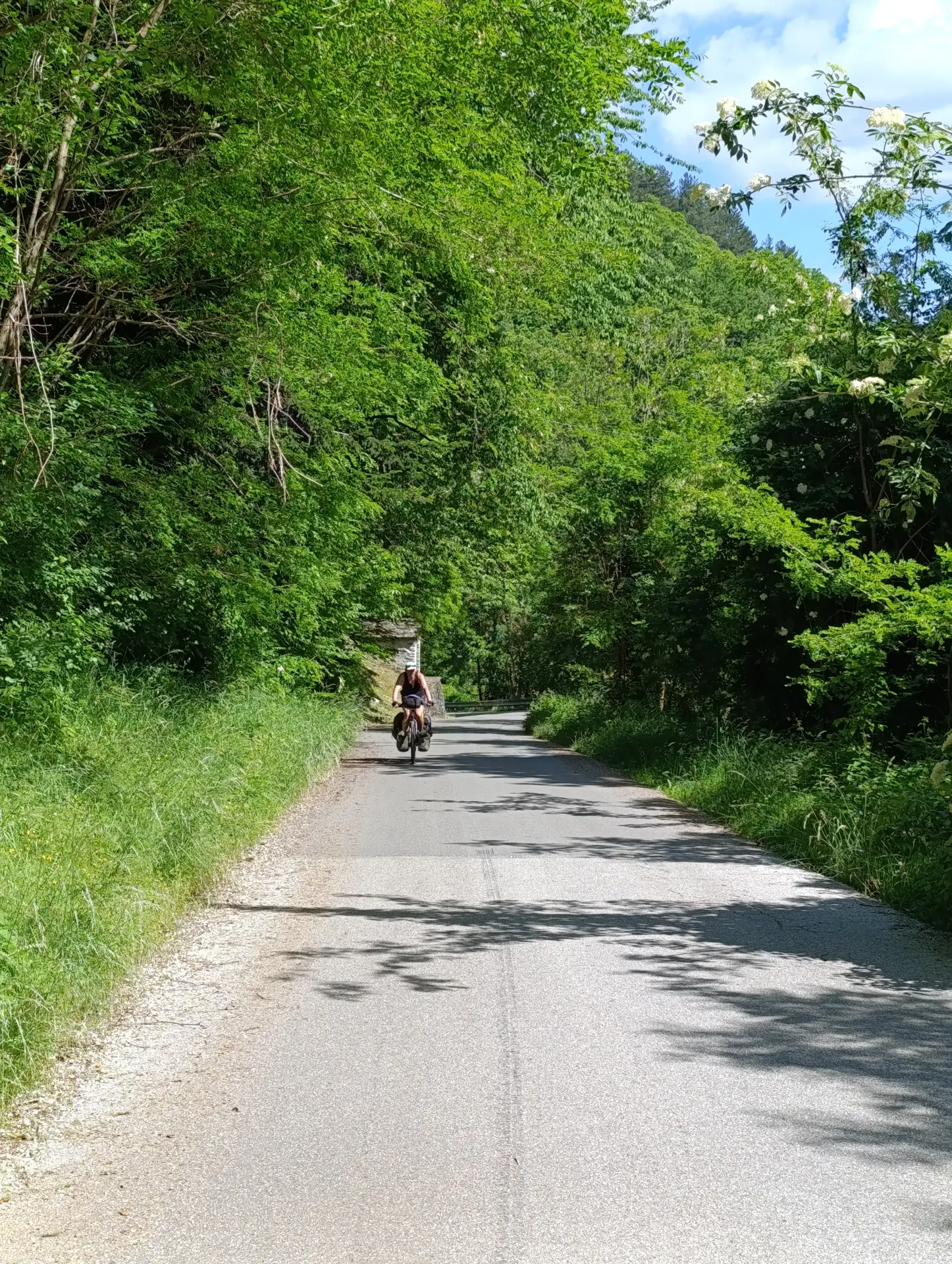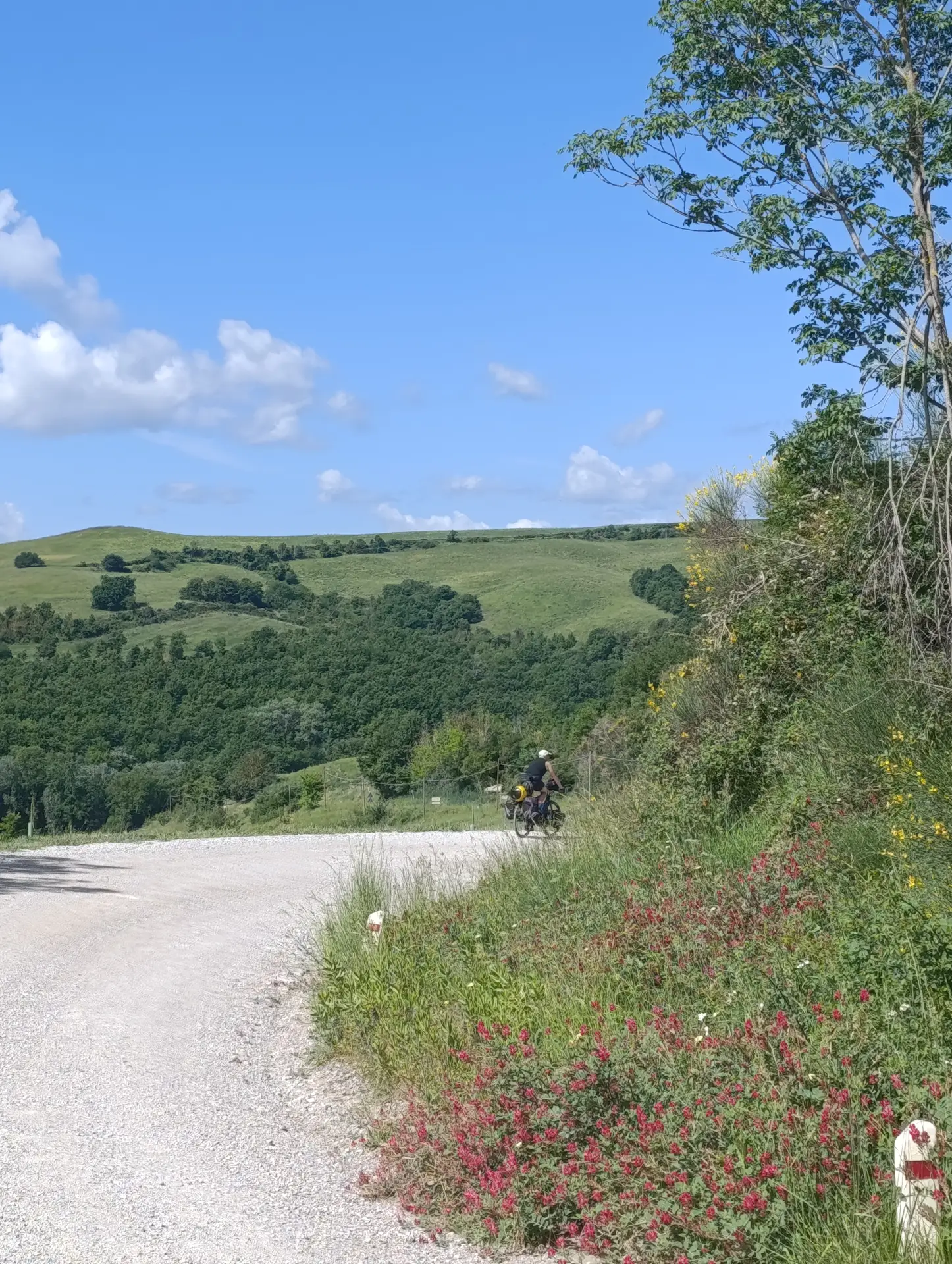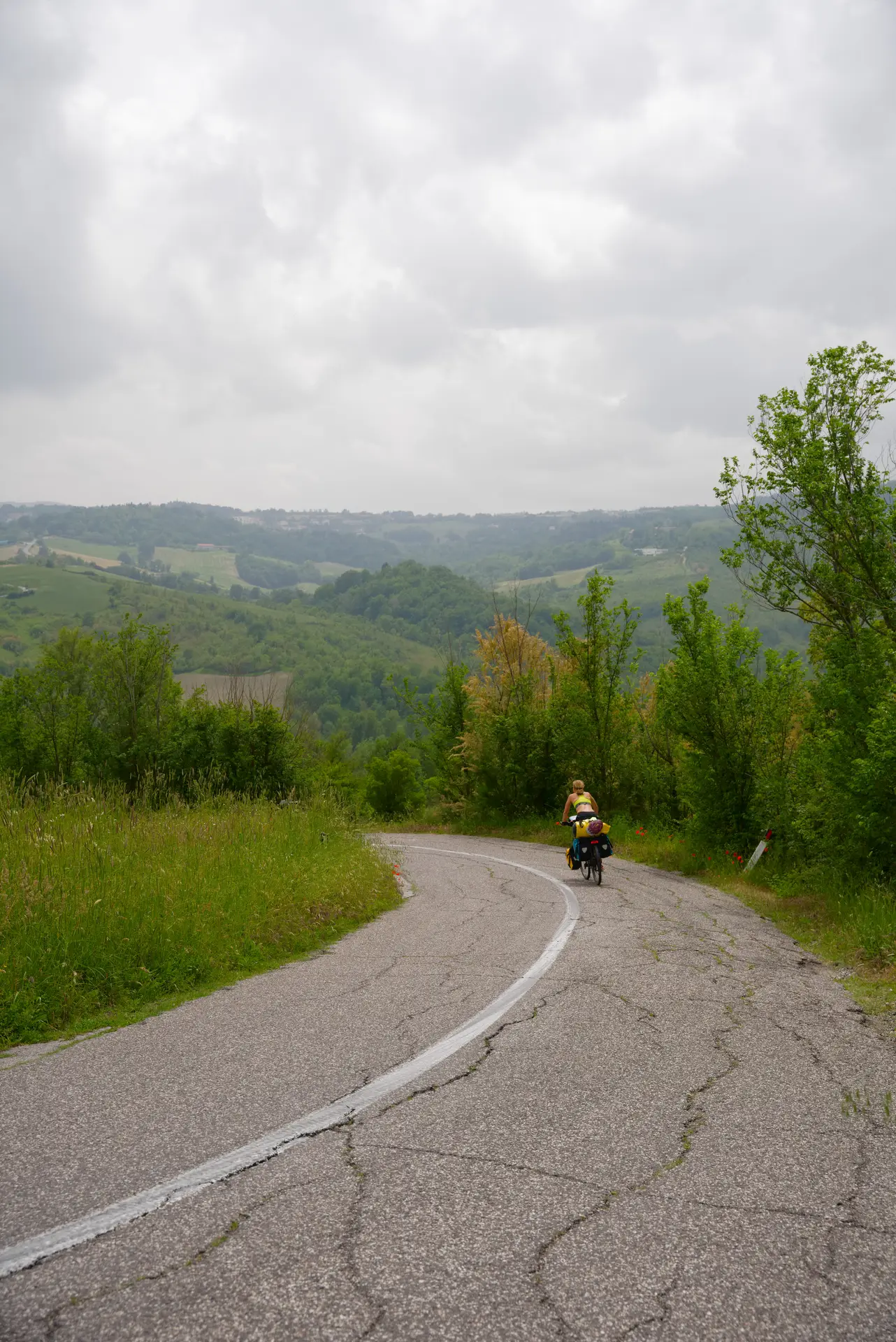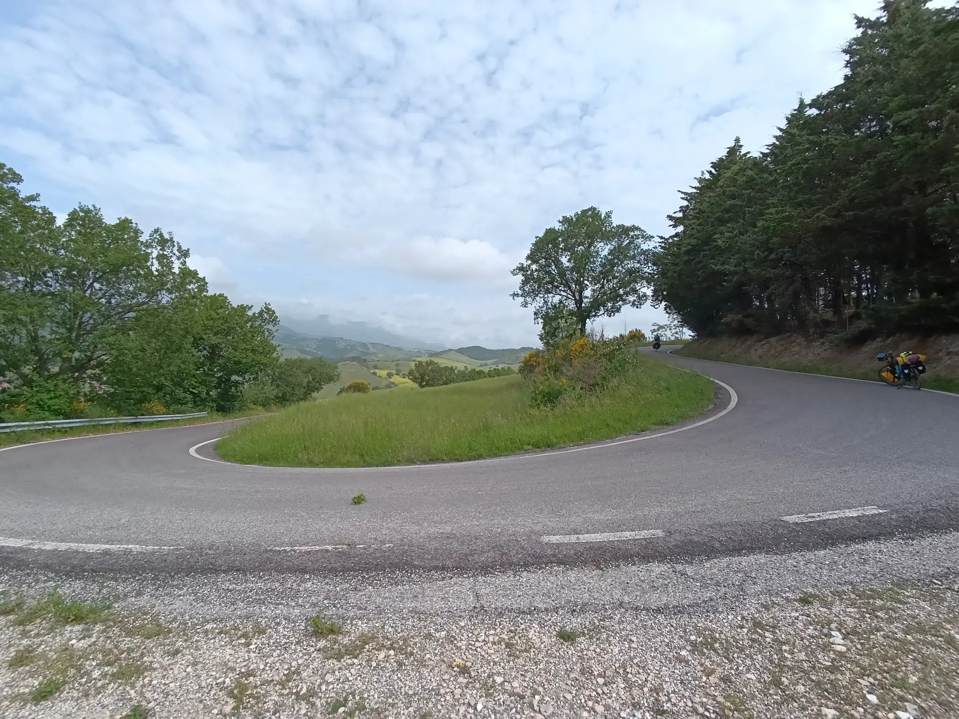 Danach verließen wir San Marino und tauchten ein in den Landstrich, der uns die nächsten Stunden prägen sollte: das Montefeltro. Hügel an Hügel reihte sich aneinander, während wir San Marino im Rücken ließen. Wir überquerten dabei den Monte del Prete und den Monte le Forche, zwei dieser unzähligen Wellen. Es war ein ständiger Wechsel aus steilen Anstiegen und rasanten Abfahrten. Bald kam dann der erste richtig harte Anstieg des Tages, bei dem wir nur noch Schlangenlinien auf der Straße gefahren sind, um die Steigung zu bewältigen. Zwischendurch gab es immer wieder kurze Schottersegmente, aber auch flachere Stücke. Die Landschaft war unglaublich grün und sanft — man muss das wirklich im Frühling machen, es war traumhaft.