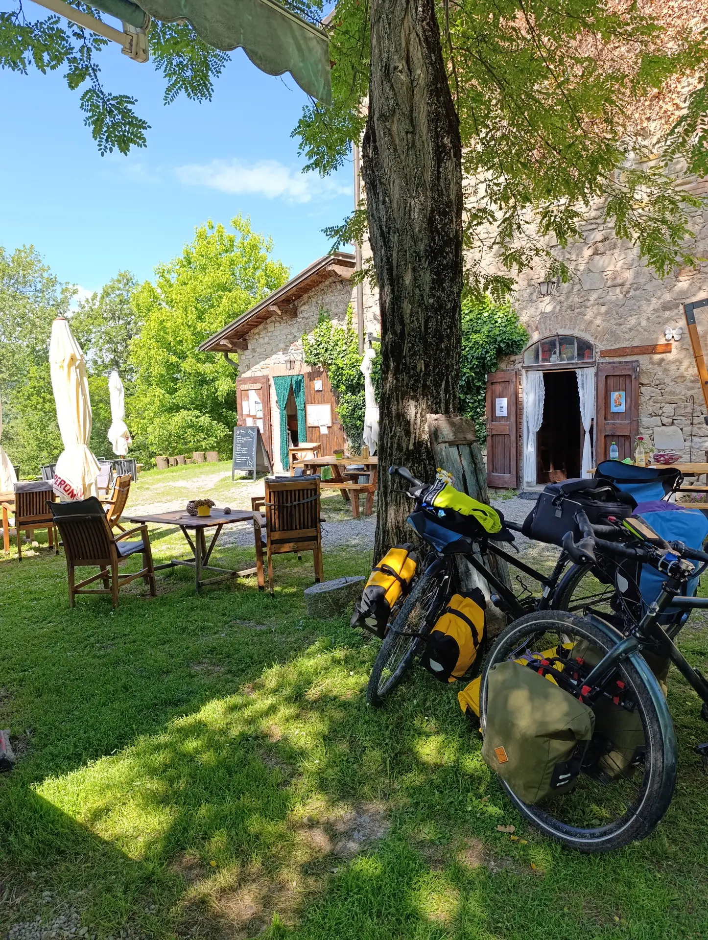 In Siena hatte uns ein anderes Radlerpärchen einen Tipp gegeben. Sie kamen gerade aus Florenz und hatten die letzte Nacht auf einem der schönsten Campingplätze verbracht, den sie je kennengelernt hatten. Den haben sie uns unbedingt empfohlen. Er liegt in einem kleinen Ort namens Romita, und unser GPX-Track führte uns direkt dorthin. Der Platz, das Camping Panorama del Chianti, ist wirklich wunderschön. Er liegt in einem Olivenhain, hat einen Pool, ein Restaurant und eine traumhafte Ruhe. Das war wirklich einer der schönsten Campingplätze unserer Reise. Dort haben wir dann auch mal wieder am Zelt gekocht und uns eine Flasche Wein gegönnt.