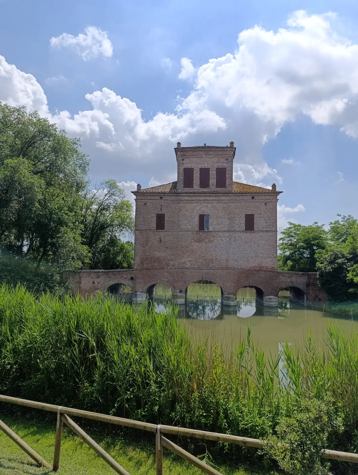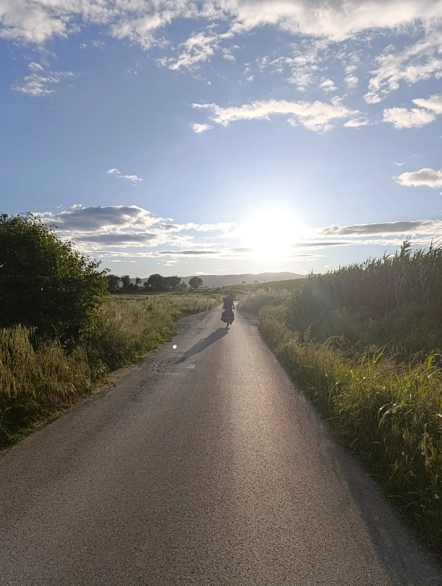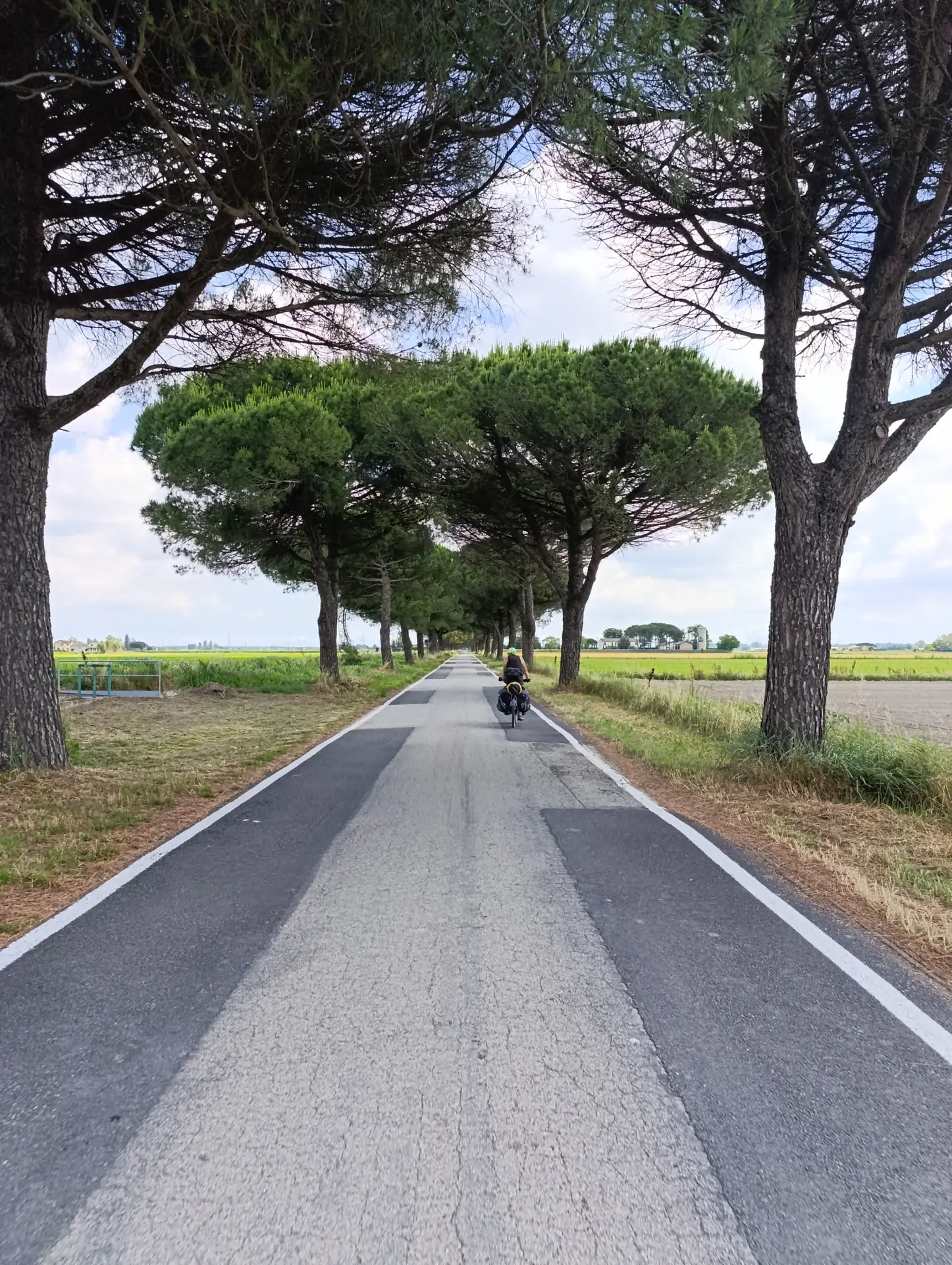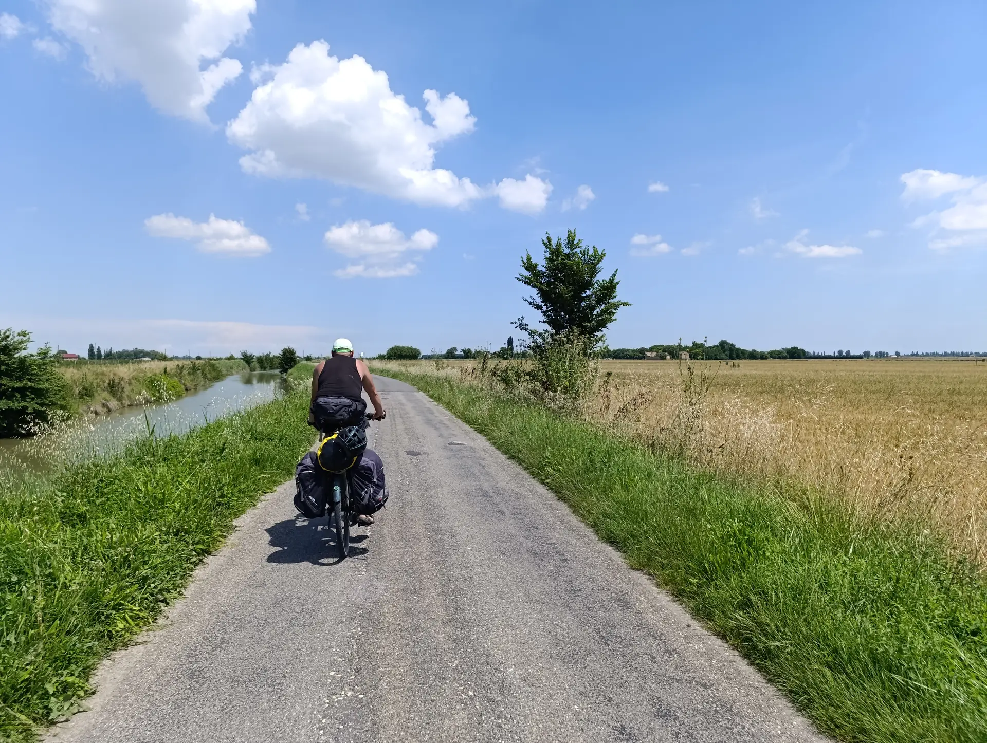 Wir sind zeitig und nur mit einem kleinen Frühstück aufgebrochen, um voranzukommen. Auf dem Radweg VM (La Via del Mare) verließen wir Bologna. Die erste ausgiebige Frühstückspause gab es dann nach etwa 20 Kilometern. Kurz darauf stießen wir auf ein lustiges Baustellenschild der Kommune Bologna für eine von der EU geförderte “Ciclovia Urbana”. Wir standen allerdings mitten in einem Schotterfeld — der Bauarbeiter nebenan hat sich sicher gefreut, dass der Radweg schon befahren wird. Die Strecke führte uns danach eine Weile an einem Fluss entlang, der leider ziemlich stank. Es war besser, als wir an ihm vorbei waren. Die Radwege BO17 (Ciclovia del Navile (Navile-Kanal-Radweg)) und CeCOM (Radweg Cento - Comacchio) führten uns in die Ebene. Ja, das ist sie schon, die Po-Ebene. Wenn man zurückschaut, verschwindet der Apennin langsam im Dunst des Horizonts, und man pedaliert endlose Kilometer geradeaus durch Felder und Wiesen.