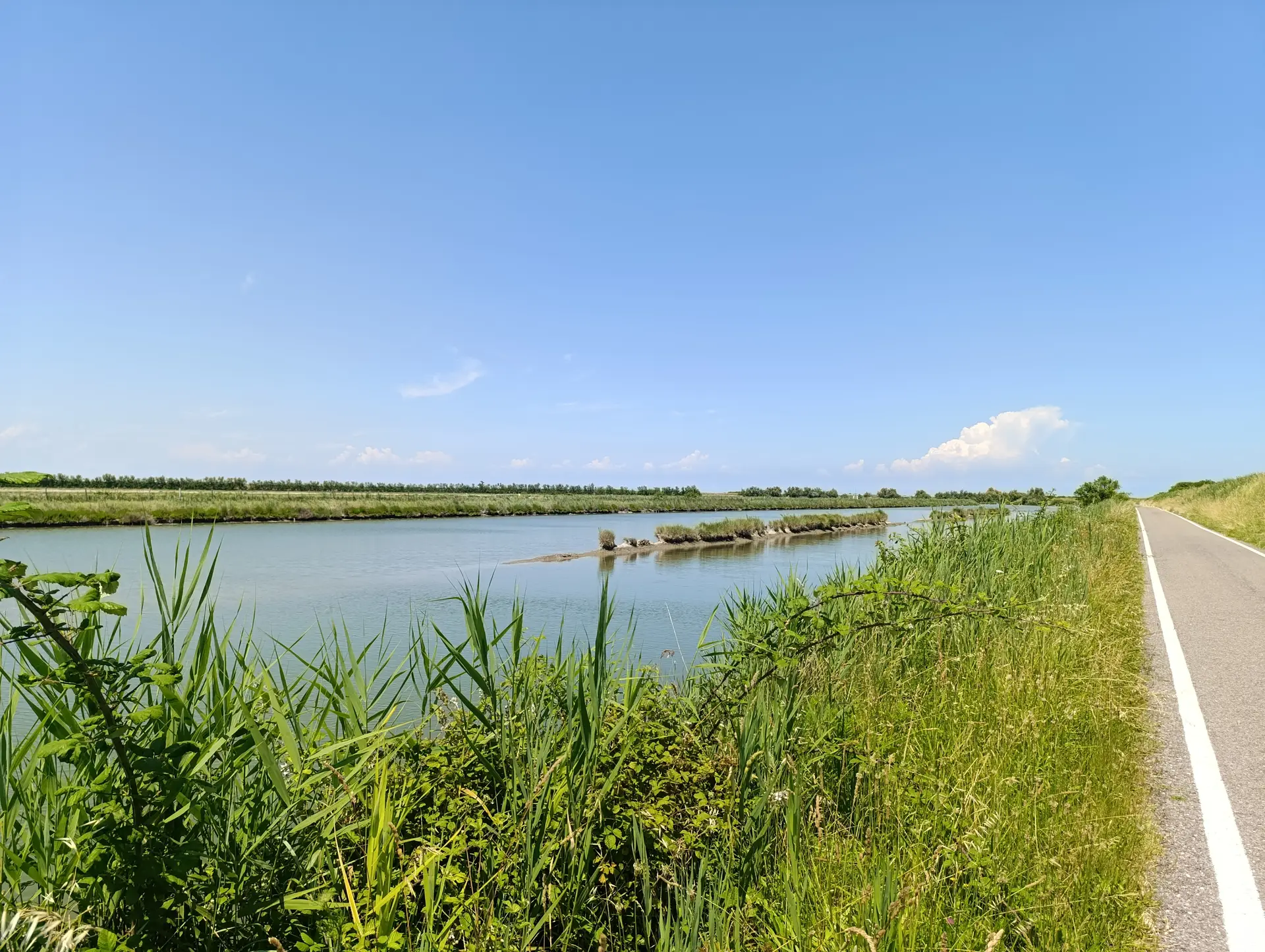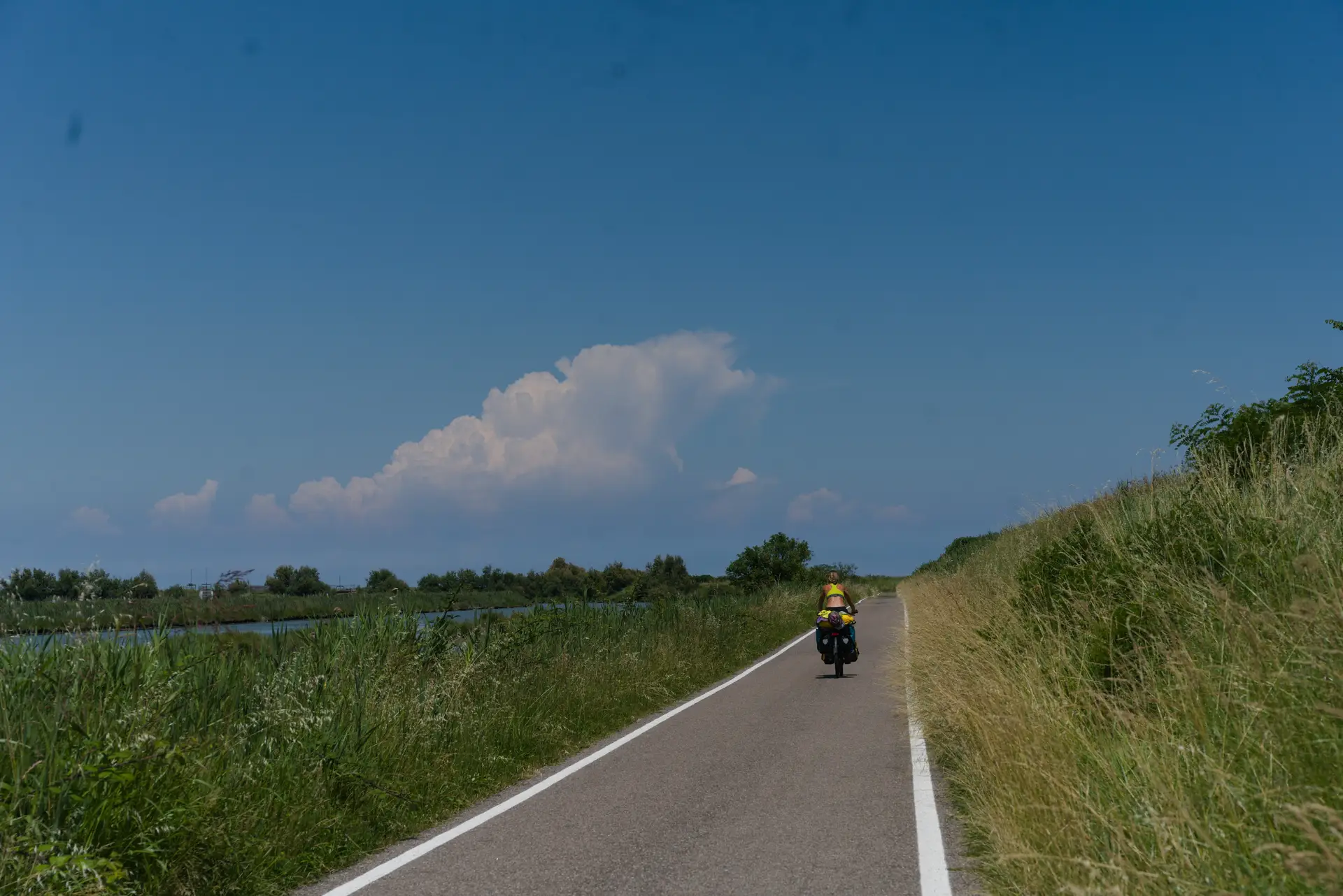 Kurz darauf waren wir mitten im Parco Regionale del Delta del Po. Was für ein wahnsinniger Kontrast zum Apennin! Plötzlich steht man in dieser weiten Deltalandschaft mit Schilf überall, und selbst die Gebäude sehen irgendwie anders aus. Wir überquerten den Po auf einer gigantischen Brücke und folgten dann kilometerlang einem Radweg auf dem Deich. Hier herrschte eine absolute Ruhe und Einsamkeit. Keine Autos, keine Motorräder und kaum andere Radfahrer. Dieser Landstrich, den ich vorher überhaupt nicht auf dem Radar hatte, war eine der positivsten Entdeckungen der Reise. Der Radweg, der sich hier durch das Delta schlängelt – auf ungenauen Karten sieht es aus, als würde man übers Wasser fahren – ist Teil der Fernroute Bicitalia 2 (Ciclovia del Po e delle Lagune). Eine absolute Empfehlung!