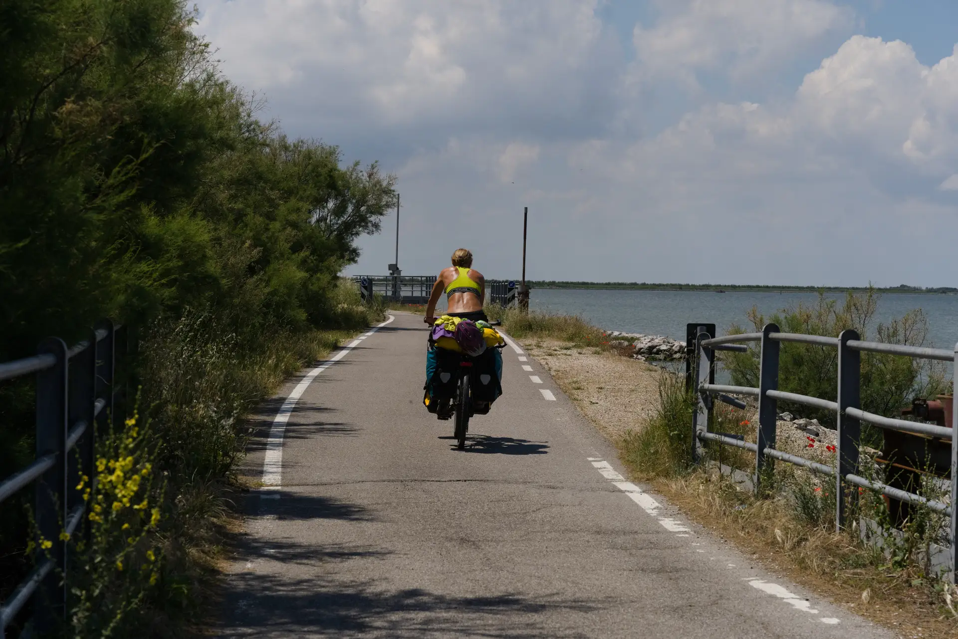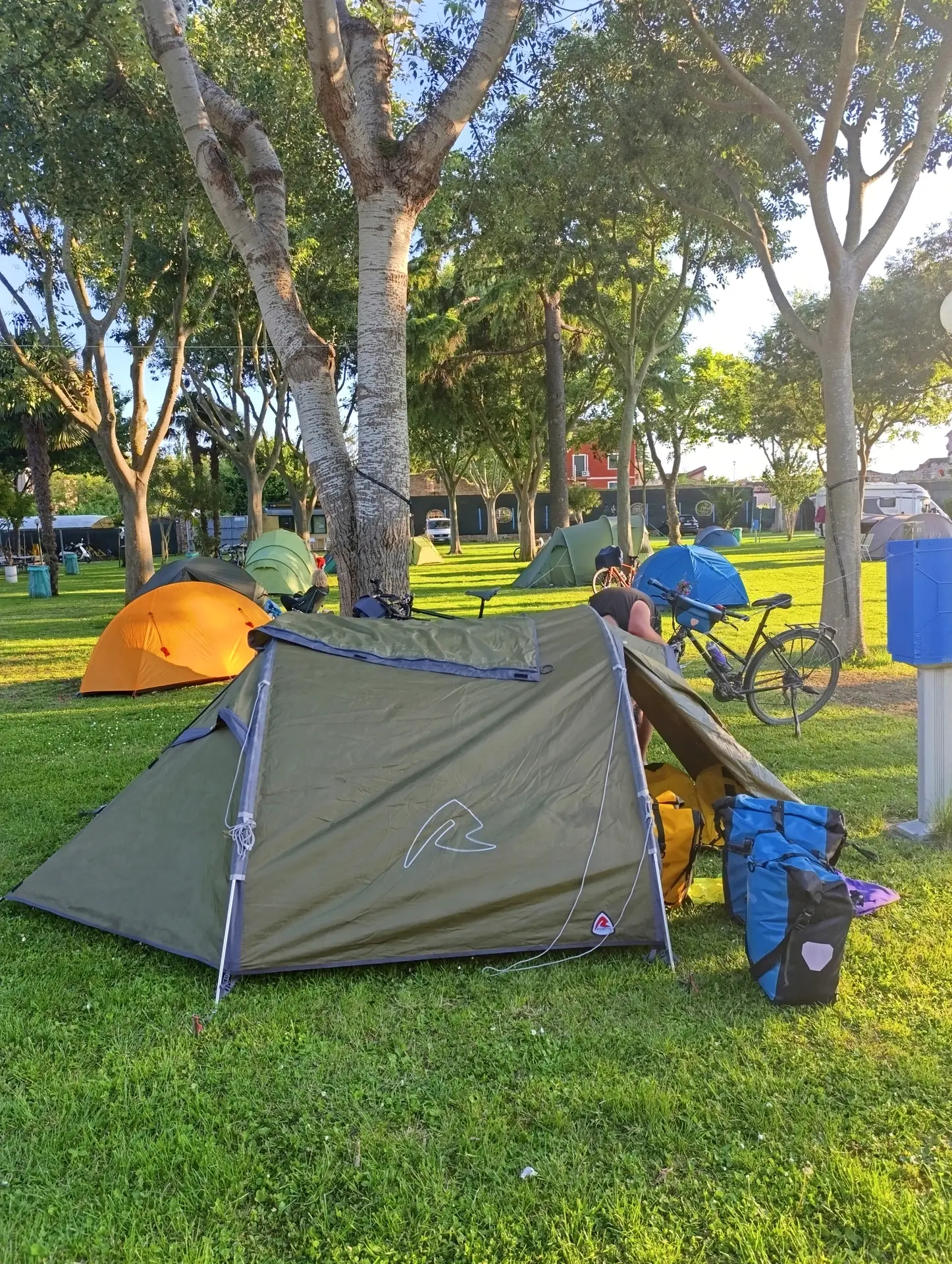 Wenige Kilometer später standen wir plötzlich mit unseren Rädern wieder an der Adria, dort, wo unsere Reise begonnen hatte. Der Strand war schön, das Wasser warm. Wir checkten auf einem riesigen Campingplatz in Porto Garibaldi ein, hatten aber auf der Zeltwiese unsere Ruhe. Das einzige Problem: die Mücken. Es gab unglaublich viele davon. Aber ansonsten ein sehr schöner Platz, auf dem man auch als Radfahrer sehr willkommen ist, selbst wenn man mal wieder der Einzige ist.