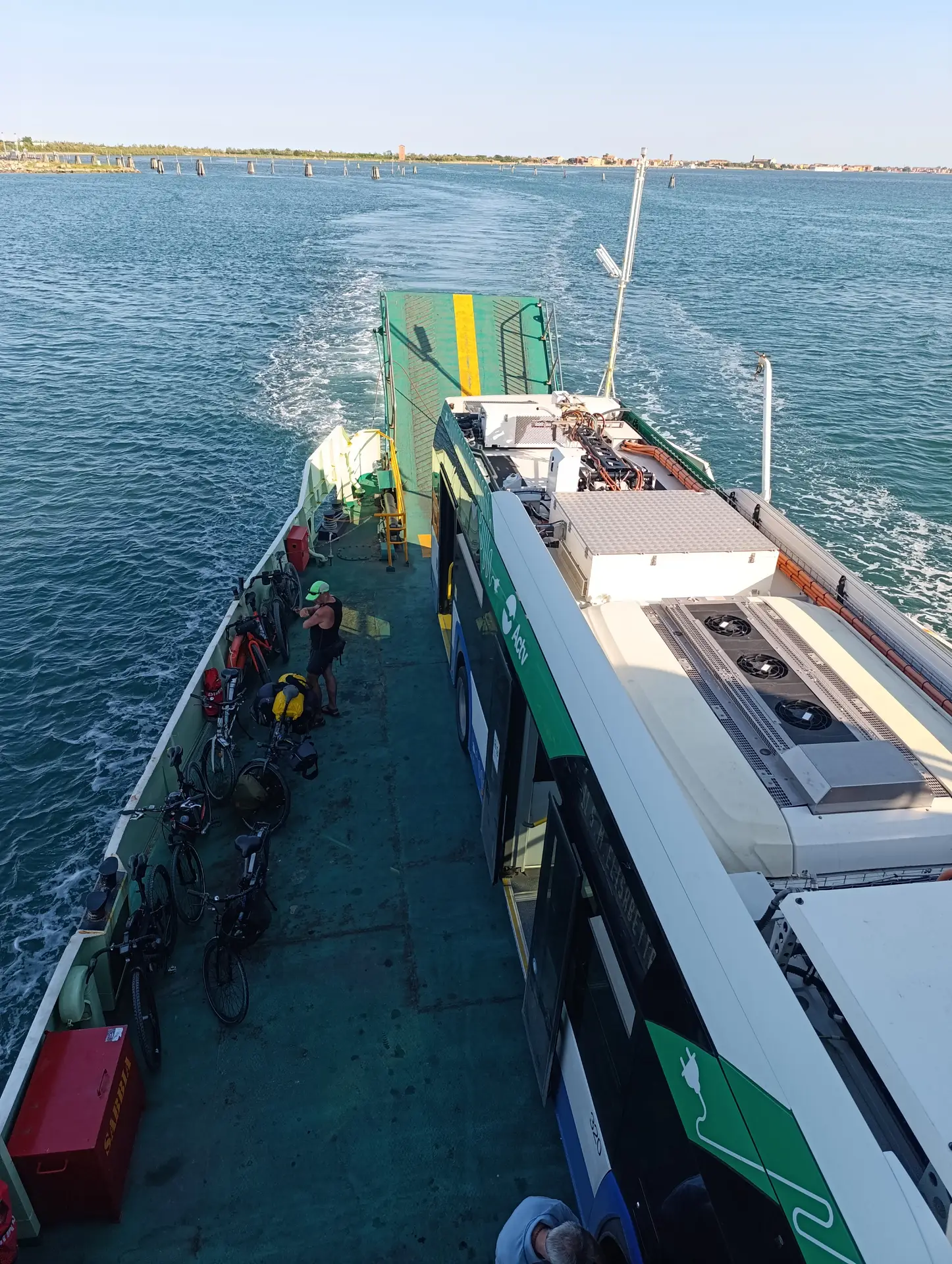 In Chioggia fanden wir dann auch den EuroVelo 8 wieder, der ganz offiziell die Fährverbindung nach Pellestrina nutzt. Es war eine sehr schöne Überfahrt. Um noch mit demselben Ticket weiterzukommen, sind wir die 10 Kilometer über die schmale Insel Pellestrina direkt durchgefahren bis zum nördlichen Fähranleger in Santa Maria del Mare. Von dort ging es das letzte kleine Stück mit der Fähre hinüber zum Lido di Venezia.