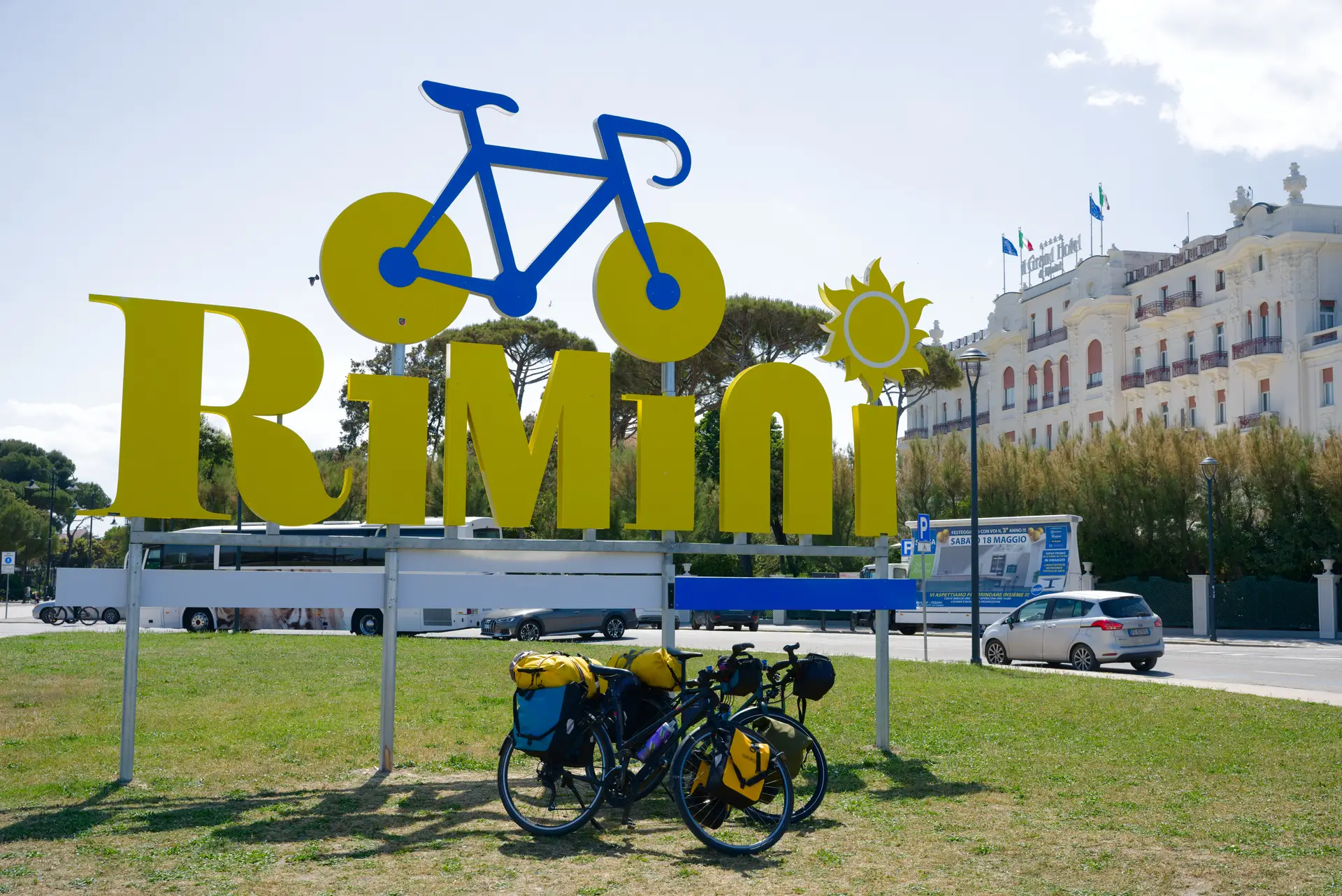 Unsere Reise begann am 18. Mai mittags an einem wunderschönen Strandabschnitt in Rimini — der Rotonda Lucio Battisti — vor einem riesigen “Rimini”-Schriftzug mit Fahrrad oben drauf. Perfekt.