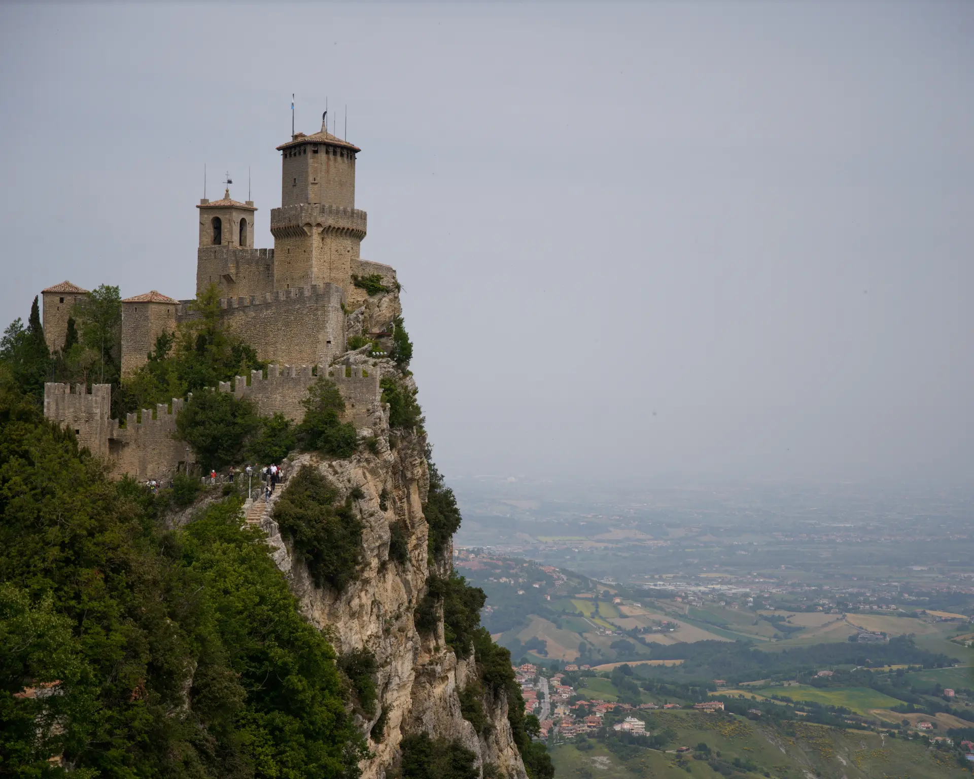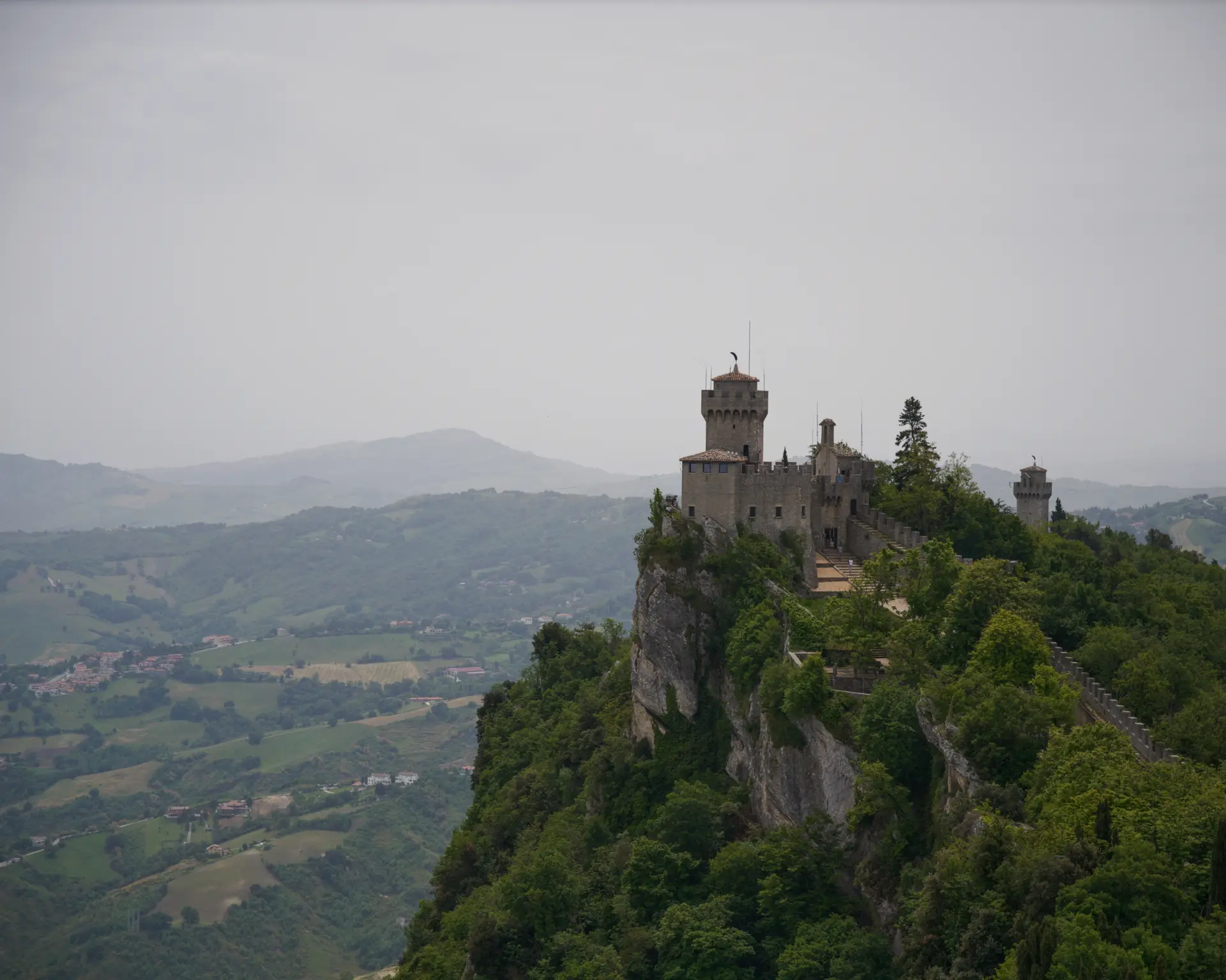 Als wir Rimini bei freundlichem Wetter und leichter Bewölkung verließen, wurden die Straßen schnell kleiner und die Landschaft hügeliger. Immer wieder konnten wir schon aus der Ferne unser Ziel erblicken: die beeindruckende Silhouette von San Marino. Gegen Abend erreichten wir schließlich die Grenze zur Republik. Von dort aus ging es über abenteuerlich steile Straßen hinauf zum Campingplatz.