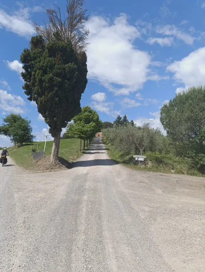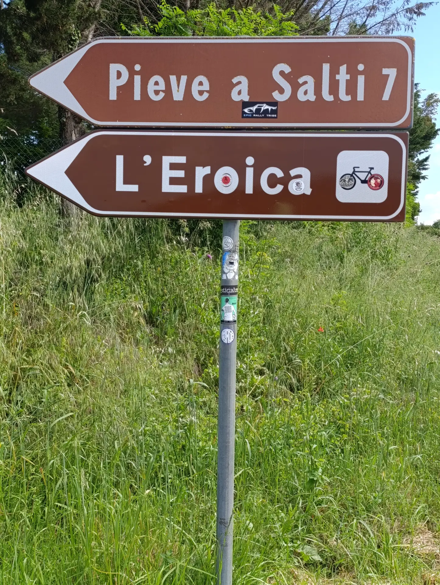 Wir begannen unseren Tag auf der berühmten L’Eroica. Nach ein paar Schnappschüssen rollten wir endlich auf einer echten “Strada bianca” durch diese wunderschöne Gegend. Es ist wirklich so schön, wie immer alle sagen. Nach einer kleinen, aber feinen Pause in Buonconvento, wo wir in einer Bar direkt am historischen Stadttor saßen, ging es weiter durch eine zauberhafte Landschaft, vorbei an Schildern der “Via Francigena Gravel”.
