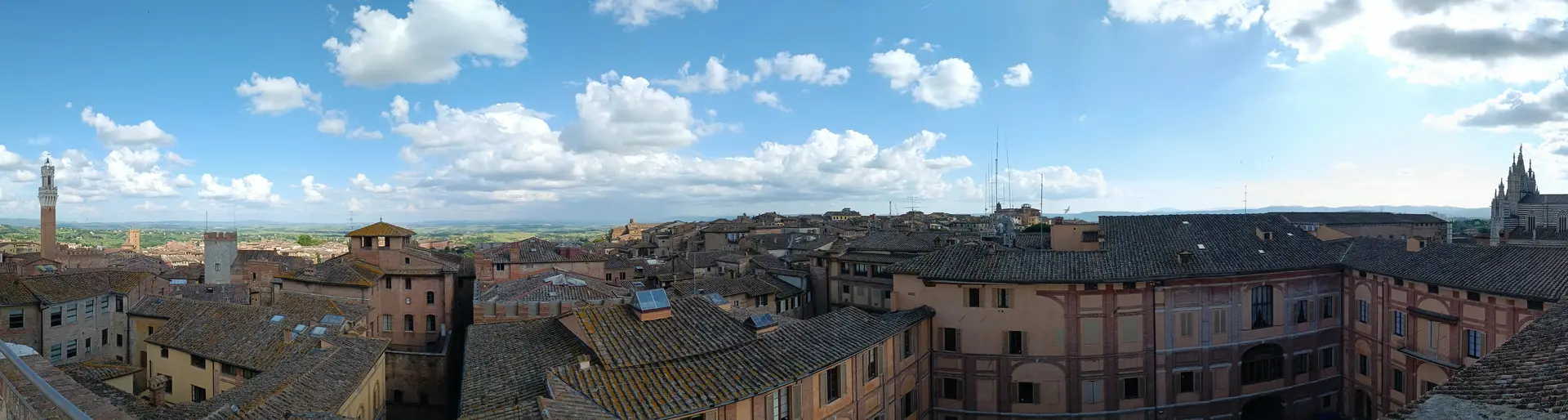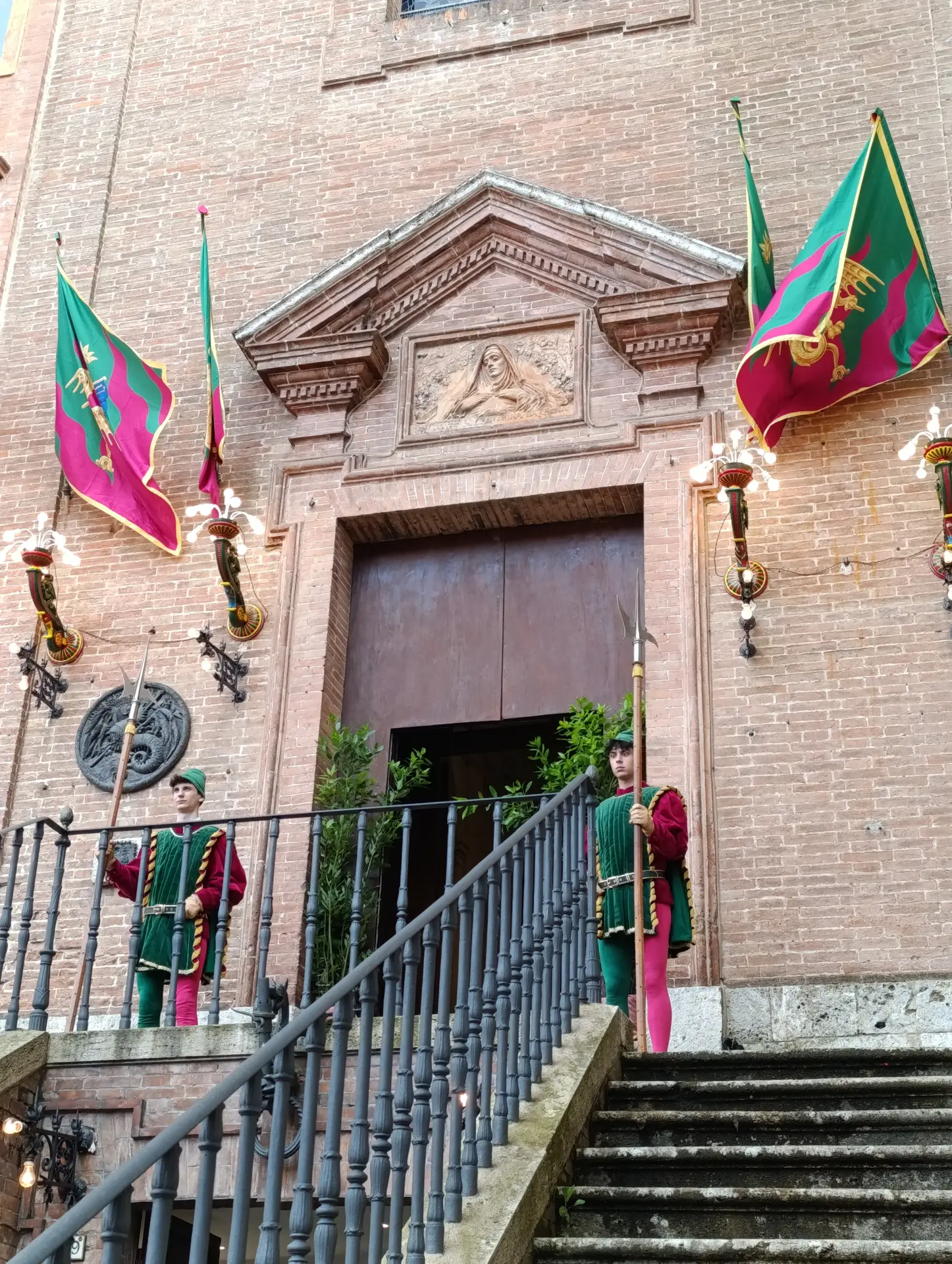An einem Tag nutzten wir die berühmte Rolltreppe, um vom Busbahnhof in die Stadt zu gelangen, und gönnten uns erst einmal ein Eis auf einem Hügel mit fantastischem Blick über die Dächer in Richtung Dom. Mitten in der Stadt stießen wir dann auf die Vorbereitungen für eine Festivität. Leute in historischen Kostümen säumten die Straßen, Männer mit bunten Strumpfhosen und Lanzen bewachten Eingänge, und junge Fahnenschwinger, die Alfieri, übten ihre kunstvollen Würfe. Es waren die Mitglieder der Contraden, der Stadtteile Sienas, die sich auf ihre Wettkämpfe vorbereiteten. Ein faszinierender Einblick in die lebendige Tradition der Stadt.