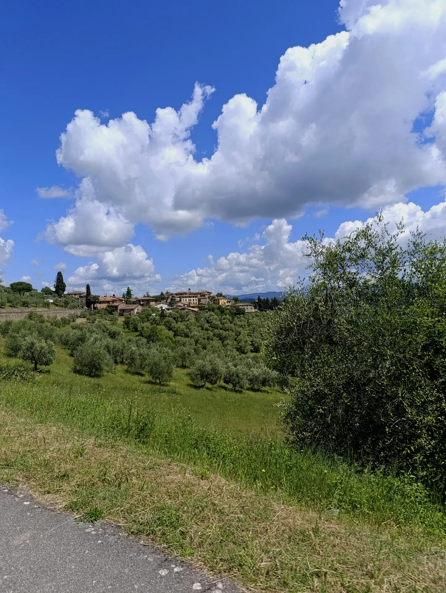 Weil es so schön war, sind wir der Straße bis Montagnana gefolgt. Dann kam eine Abfahrt nach Cerbaia in Val di Pesa, wo ich mich prompt ein kleines bisschen verfranzt habe. Wir bogen auf die Via Empolese ein, die sich als ziemliche Rampe entpuppte. Mitten im Anstieg wurden wir von einem großen Auto sehr vorbildlich überholt, der Fahrer zeigte schon aus dem Fenster den Daumen nach oben. Oben angekommen, stand er da und wartete auf uns. “Mit solchem Gepäck hier hoch, absoluter Respekt! Wollt ihr Wasser haben? Einen Espresso?”