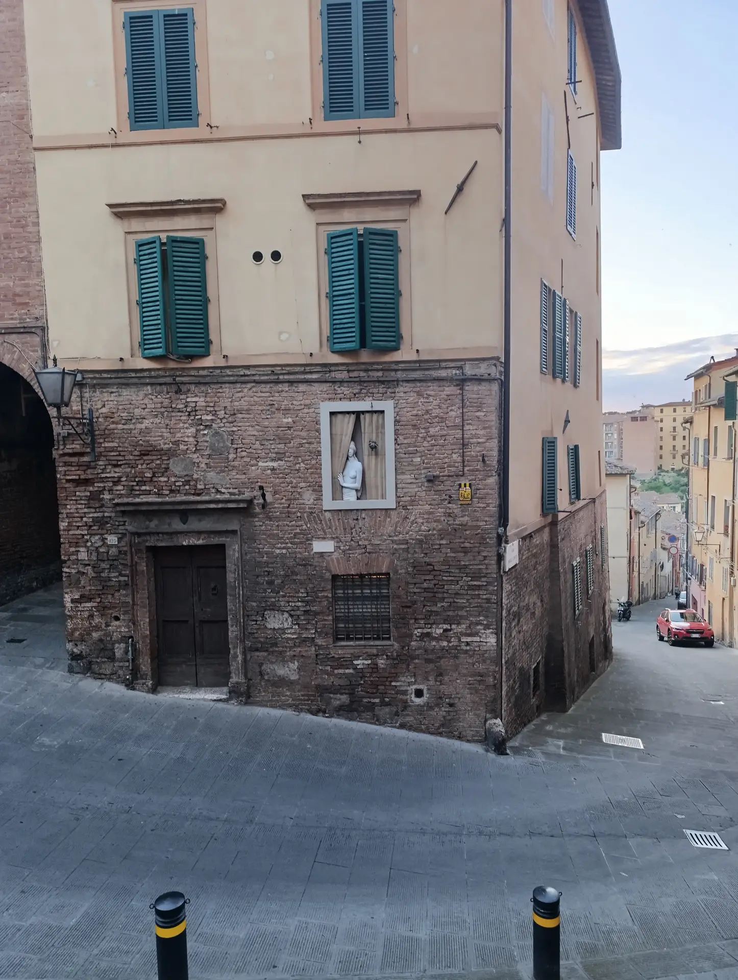 An einem unserer letzten Tage stiegen wir noch auf die Aussichtsplattform am Dom, den Panorama dal Facciatone. Es ist der unvollendete Teil des “Duomo Nuovo”, und der Blick von dort oben über die Stadt, den Campo und den Dom ist absolut imposant. Zum krönenden Abschluss, am Abend des 28. Mai, sahen wir sie dann: die “weiße Frau am Fenster”, eine berühmte Trompe-l’œil-Malerei, die uns von einer Hauswand aus nachblickte. Ein perfektes Abschiedsgeschenk der Stadt.