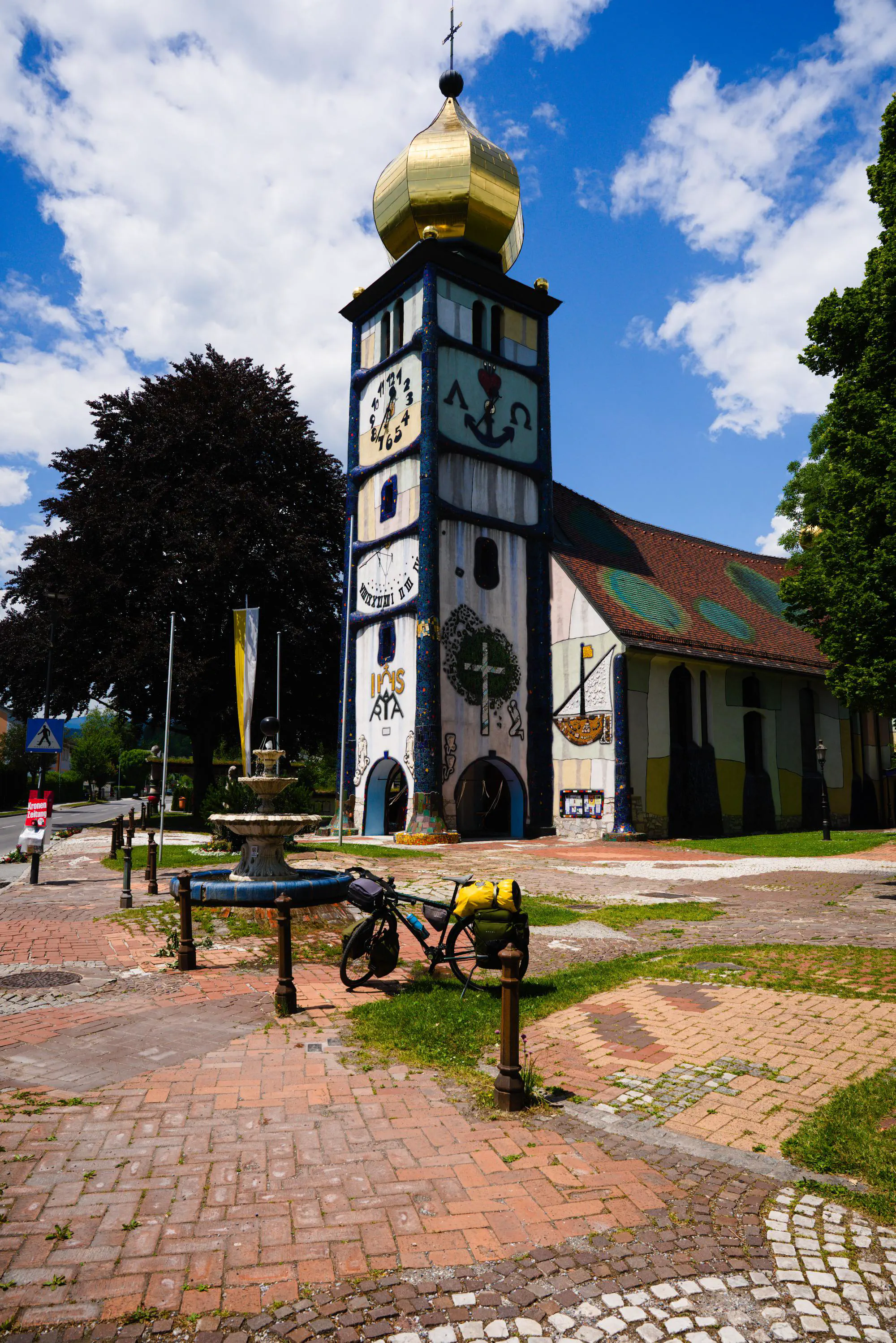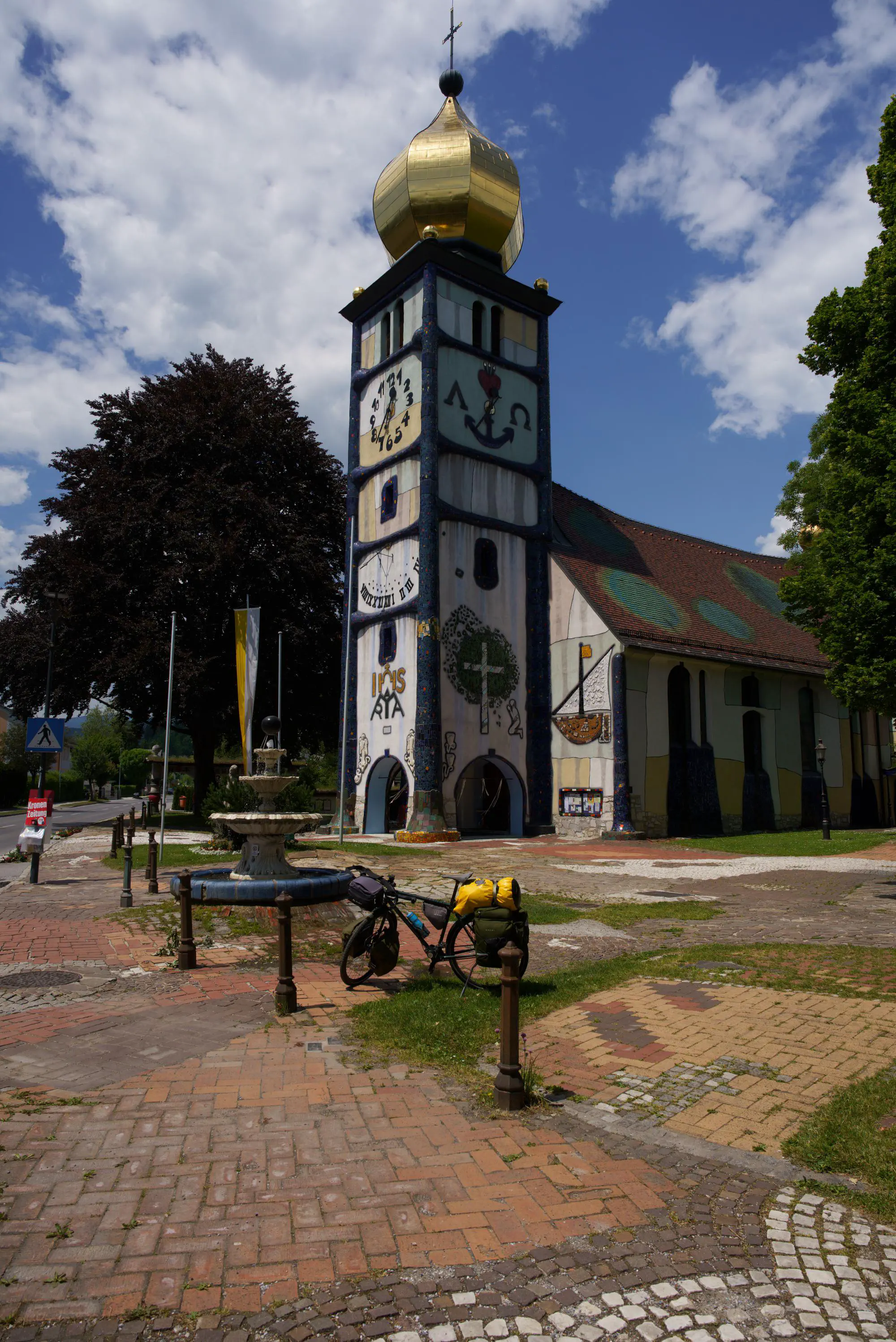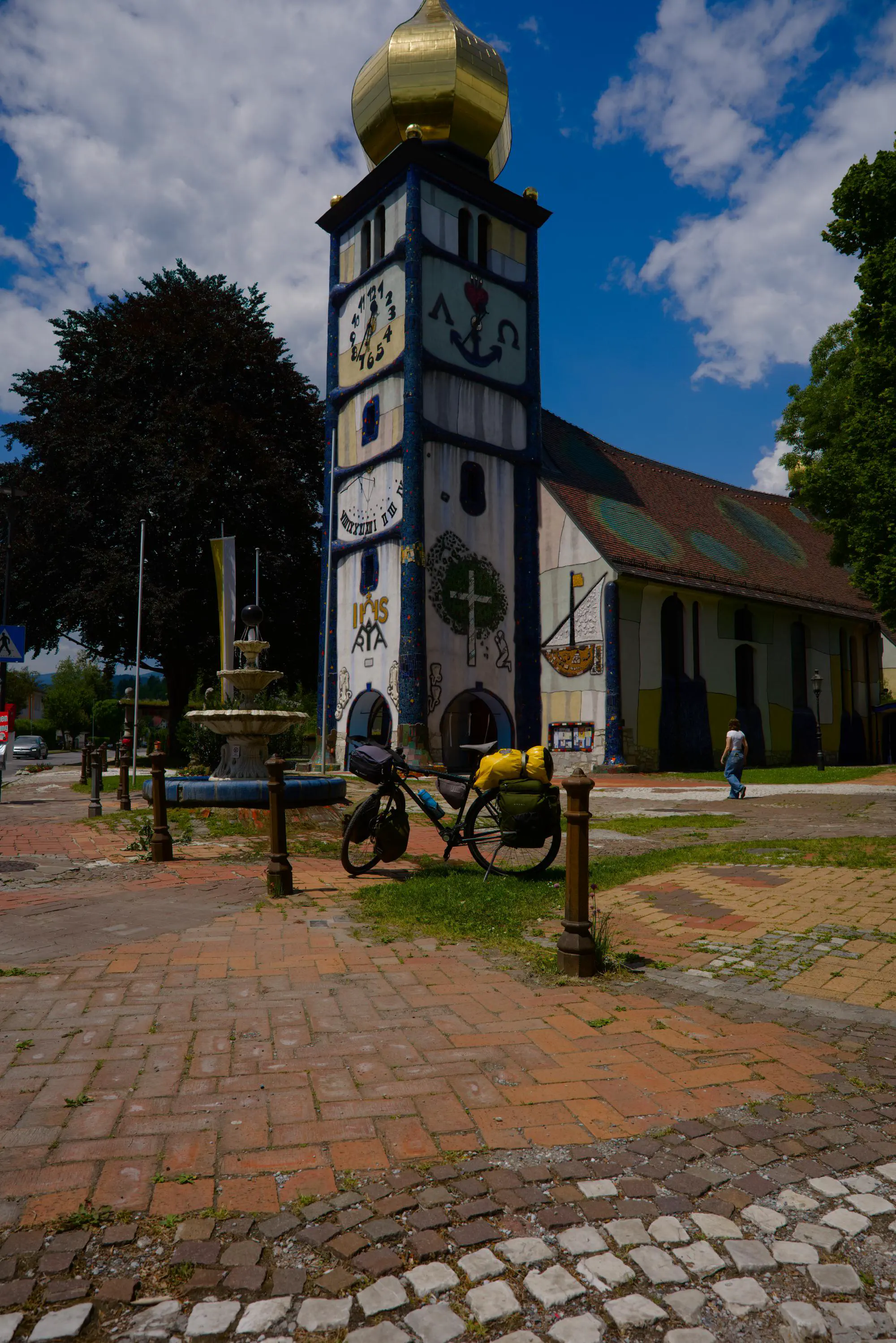 Bei Feldkirchen verließen wir das Murtal und bogen nach Westen ab, wo wir einer ganzen Kaskade von regionalen Radwegen wie dem R14 Kainachtalradweg folgten. Unser erstes großes Zwischenziel war die von Friedensreich Hundertwasser gestaltete St. Barbara Kirche in Bärnbach. Ein wirklich beeindruckendes und farbenfrohes Bauwerk. Danach ging es weiter zum berühmten Bundesgestüt Piber, der Heimat der Lipizzaner.