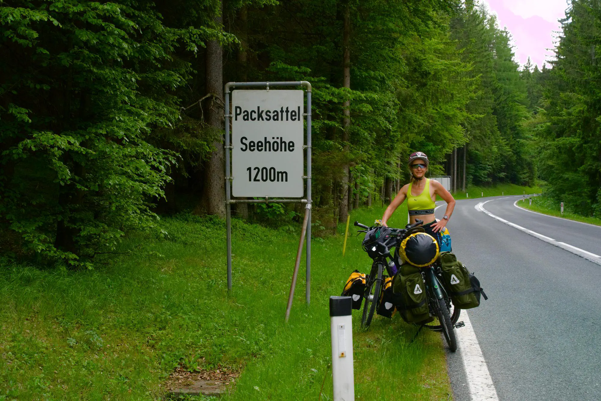 Unten ging es noch, aber diese Mega-Rampe, die dann weiter oben kommt — laut Profil ist das ein fast ein Kilometer langes, gerades Stück mit durchschnittlich 17 % Steigung — da steht der Wurzenpass wirklich wie eine Wand vor dir. Serpentinen lassen sich ja gut fahren, aber so eine gerade, brutale Rampe ist einfach etwas anderes. Wir waren beide echt am Limit, so eine Steigung sind wir noch nie mit Gepäck gefahren. Zur Hälfte des Anstiegs hörte der Regen zum Glück auf, die Sonne kam raus und die Straße dampfte schön. Oben angekommen waren wir beide völlig fertig, ich aber wohl noch ein Stück mehr als Tabea.