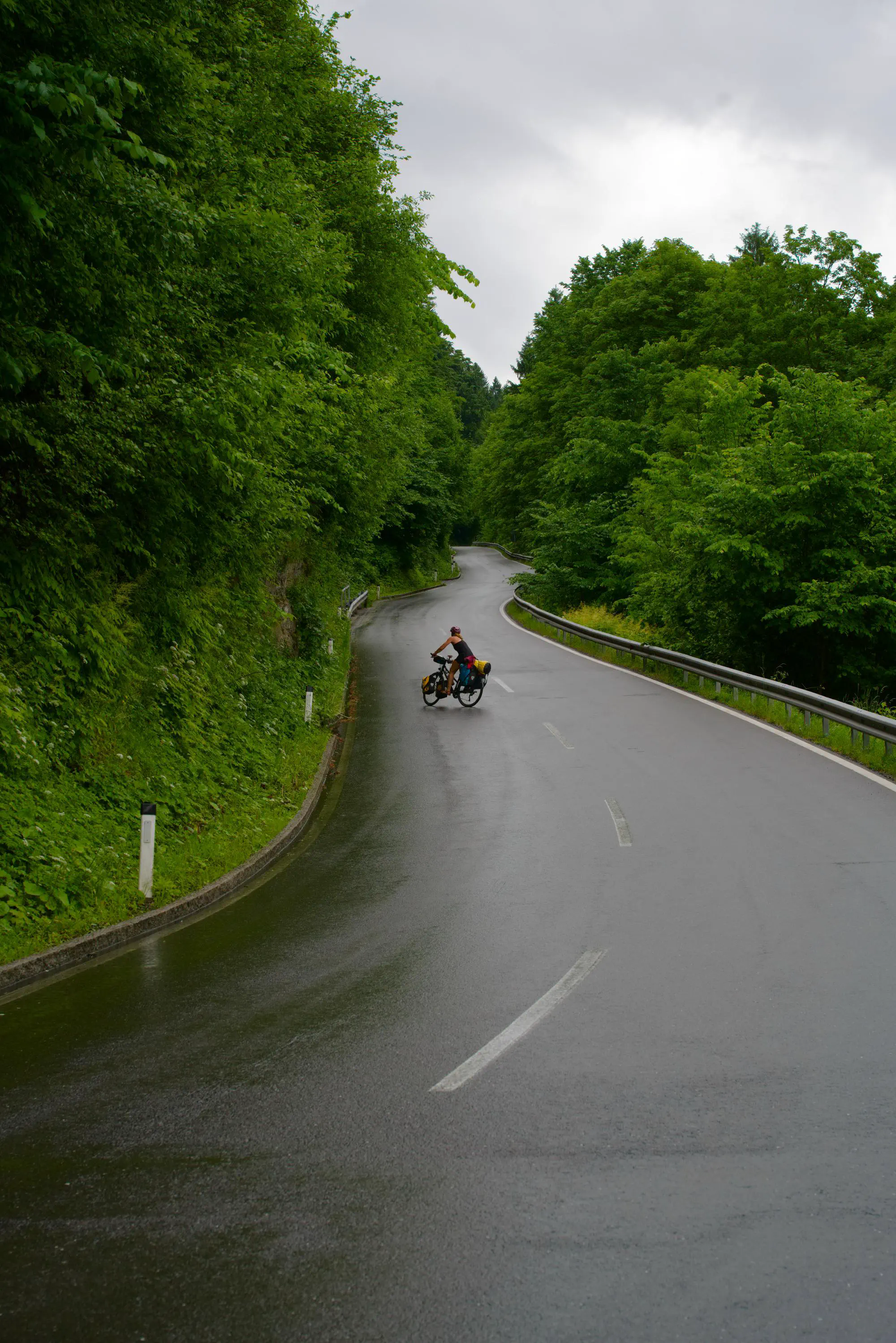 Pünktlich zum Einstieg in den Wurzenpass bei Riegersdorf begann es wieder zu regnen. In der Beschreibung auf quaeldich.de steht dazu der wunderbare Satz: “Gleich zu Beginn wird in einer Doppelkehre klar, wohin die Reise geht: nämlich steil bergauf.” Und genau so ist es.